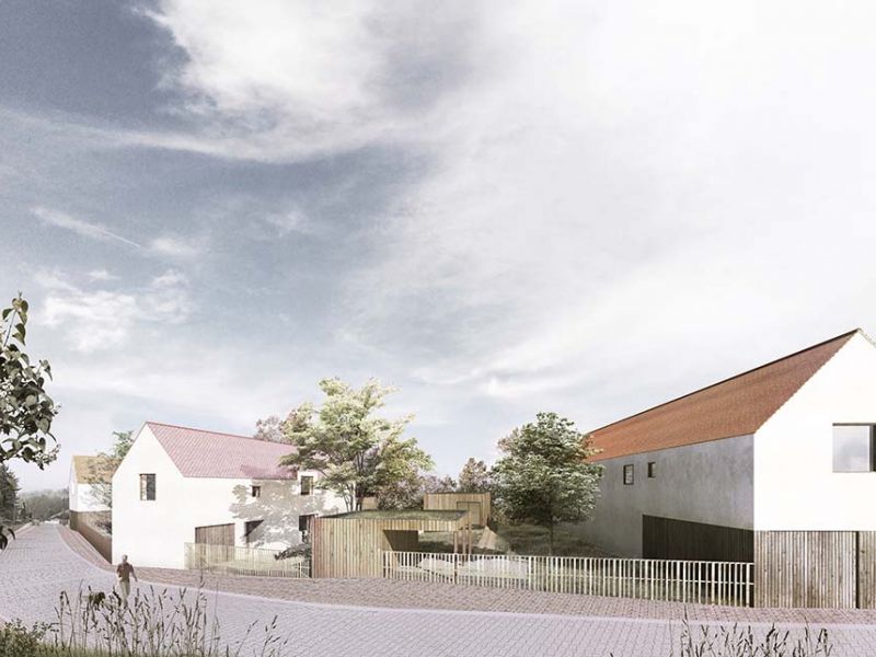 Osm individuálních rodinných domů v Praze Benicích o dispozicích 4+kk, architektonicky soudobých a střízlivých, s důrazem na udržitelnost a nízkoenergetické řešení.