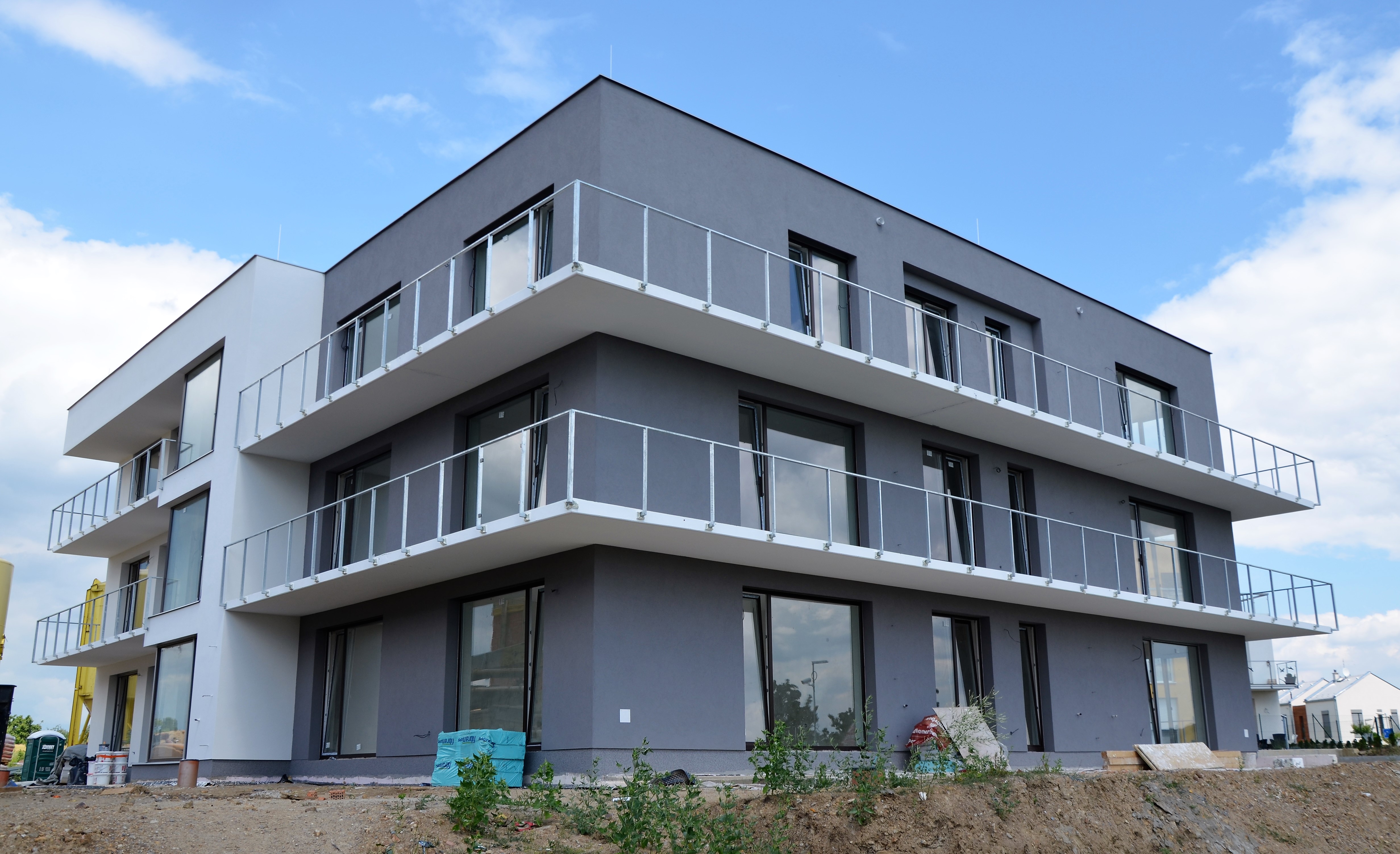 Bytový dům C3 v projektu Bydlení Jinočany má dokončenou fasádu. Tento bytový dům bude připravený k nastěhování na podzim 2018.