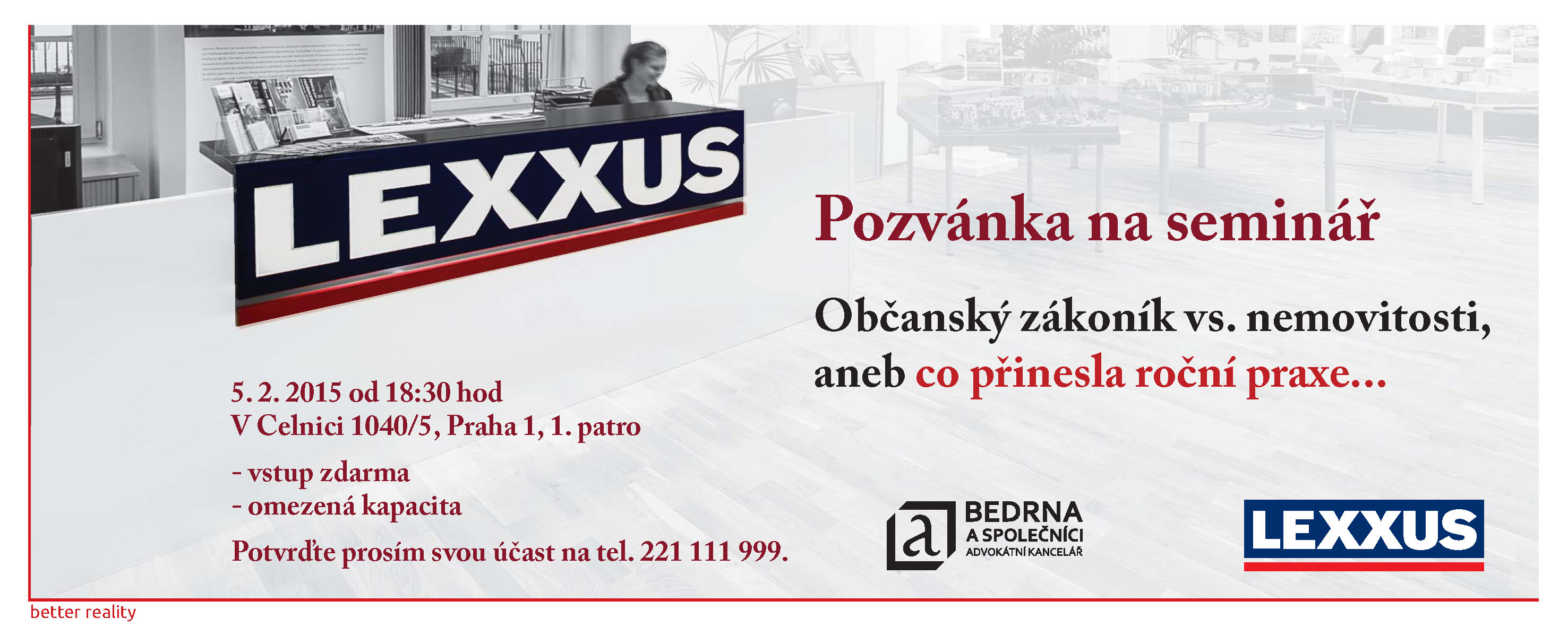 Seminář se uskuteční ve spolupráci s advokátní kanceláří AK Bedrna 5.2.2015 od 18:30 v prostorách prodejní kanceláře LEXXUS. Nejdříve v krátké prezentaci shrneme změny týkající se prodeje či pronájmu nemovitostí, které nový Občanský zákoník upravil a jaké zkušenosti první rok po změně legislativy přinesl. Další prostor bude věnován diskuzi a dotazům.