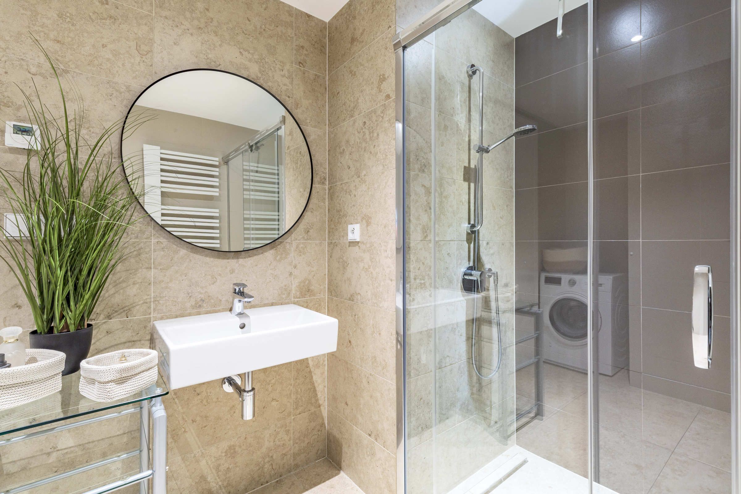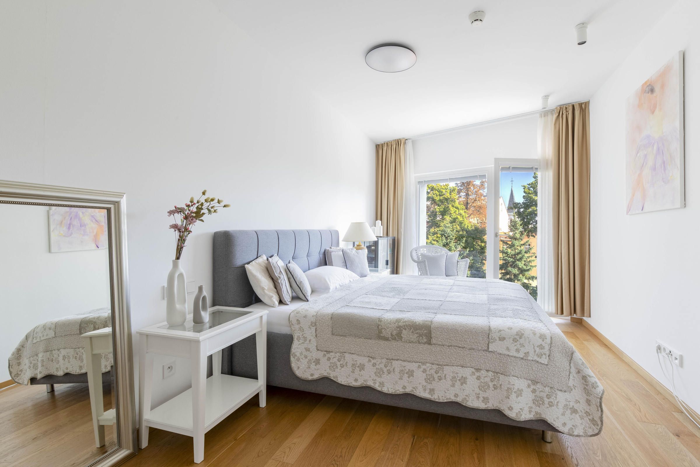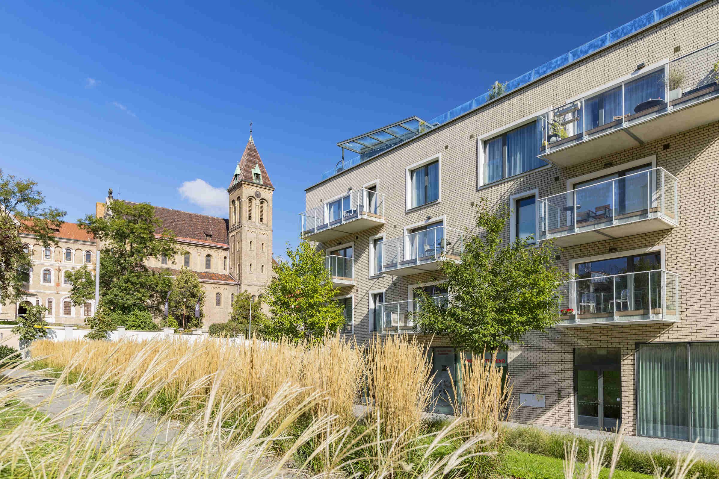 The apartment boasts a 12.6 sqm balcony with panoramic views of the Sacré Coeur gardens and the adjacent park, as well as a cellar unit and private garage parking. The interior is designed with attention to both comfort and timeless elegance: a spacious entrance hall, guest bathroom, a bright living room with an open-plan kitchen and direct access to the balcony, a bedroom, and a second bathroom with a shower. Premium features include underfloor heating and bathrooms fitted with Villeroy & Boch designer sanitary ware.