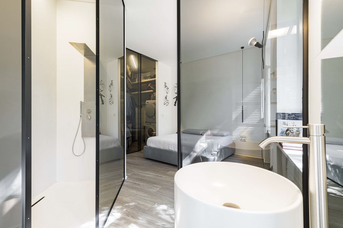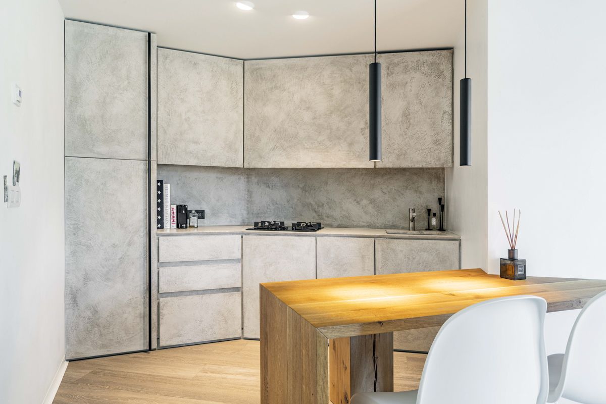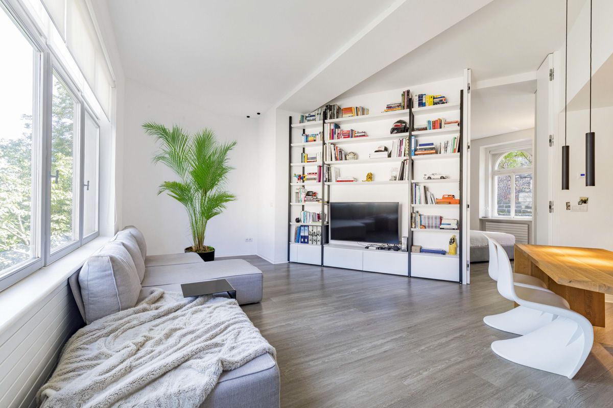 From the hallway you smoothly enter the spacious living room, which is connected to the modern kitchen. It is followed by a bedroom with a large glass walk-in closet and a glass bathroom with design elements. The entire apartment is equipped with custom-made furniture, which underlines its unique character.