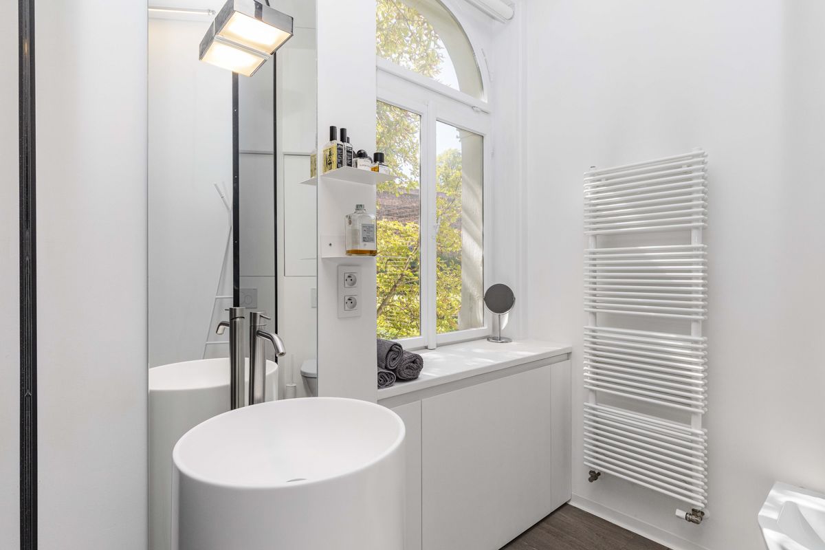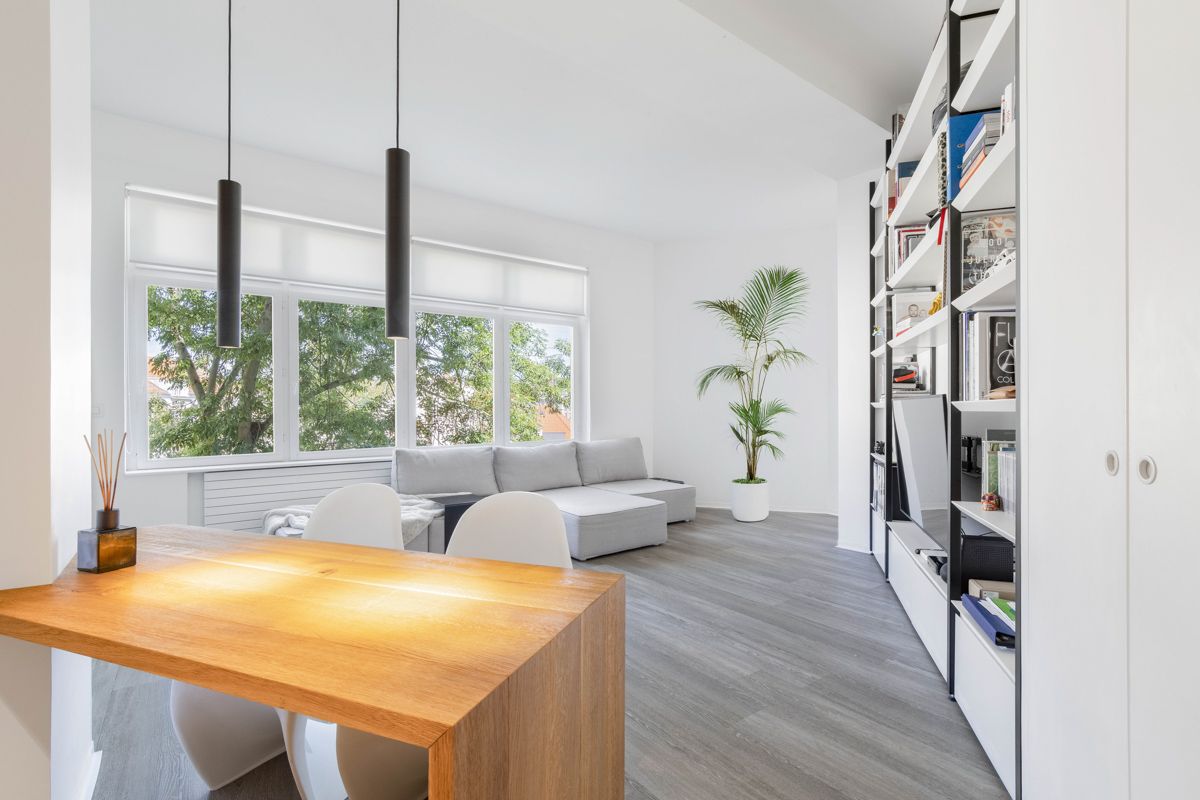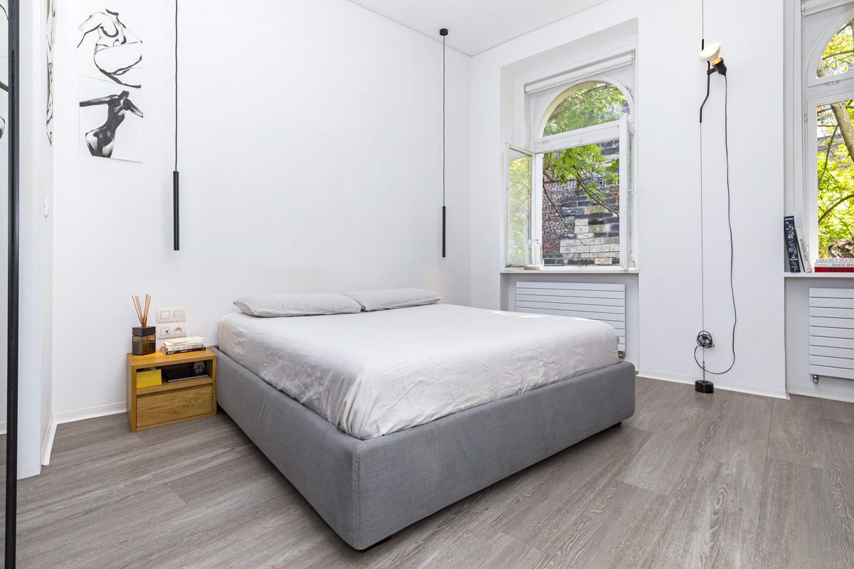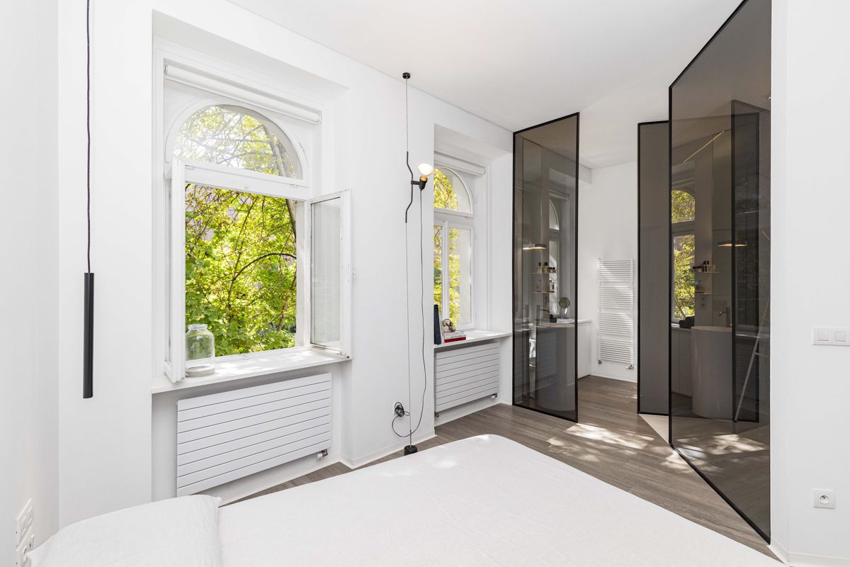 Heating and hot water are provided by a Vaillant gas boiler. The apartment has wooden window frames, vinyl floors and designer lighting fixtures that underline the modern interior style. The comfort of living is complemented by an elevator in the building.