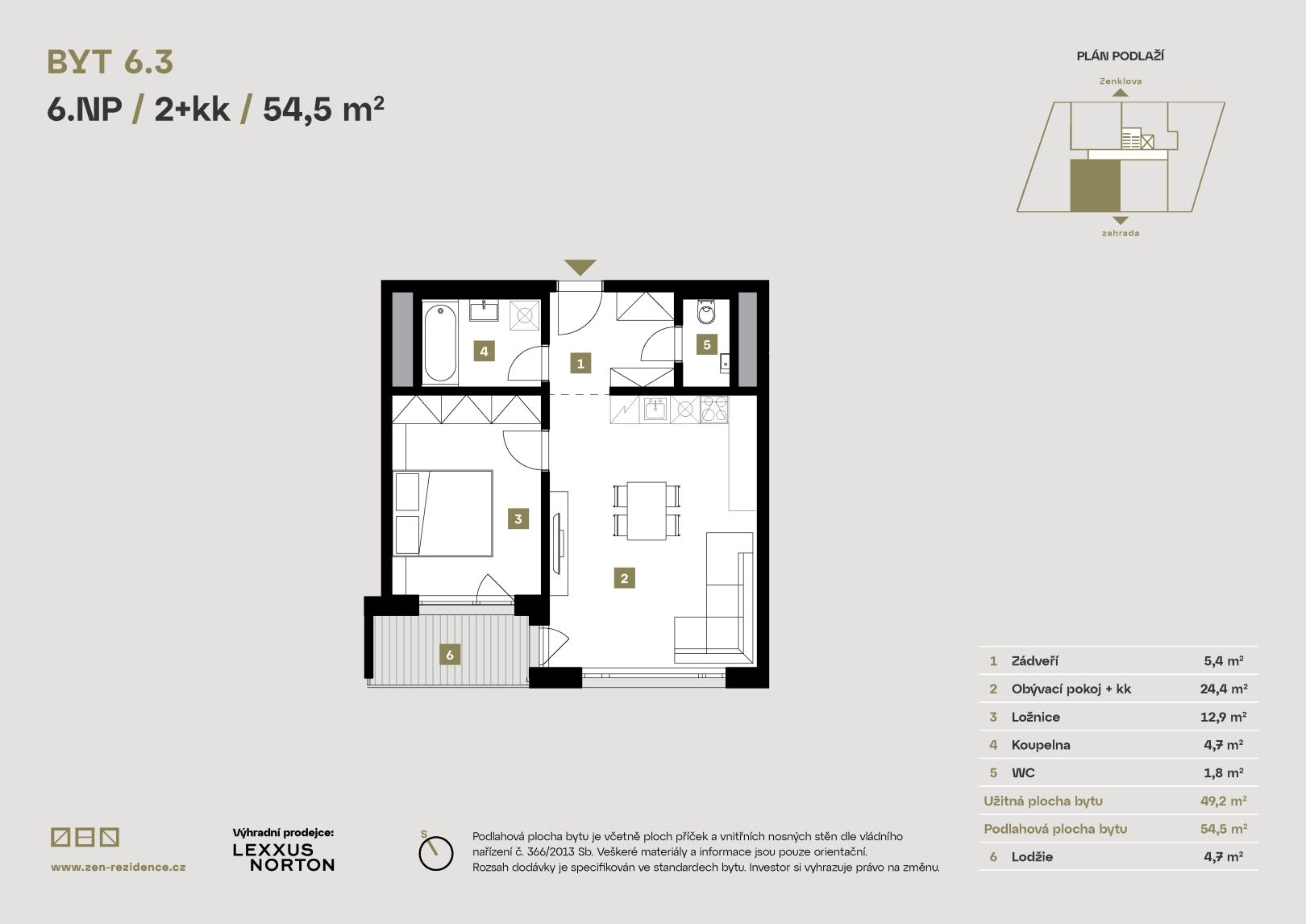 We offer a modern single-bedroom apartment with a total area of 54.51 sqm, located on the 6th floor of the prestigious ZEN Rezidence project in Prague's Liben. This apartment with a north-facing loggia (4.7 sqm) and a well-thought-out layout provides an ideal combination of comfort, functionality, and stylish living close to the city center.