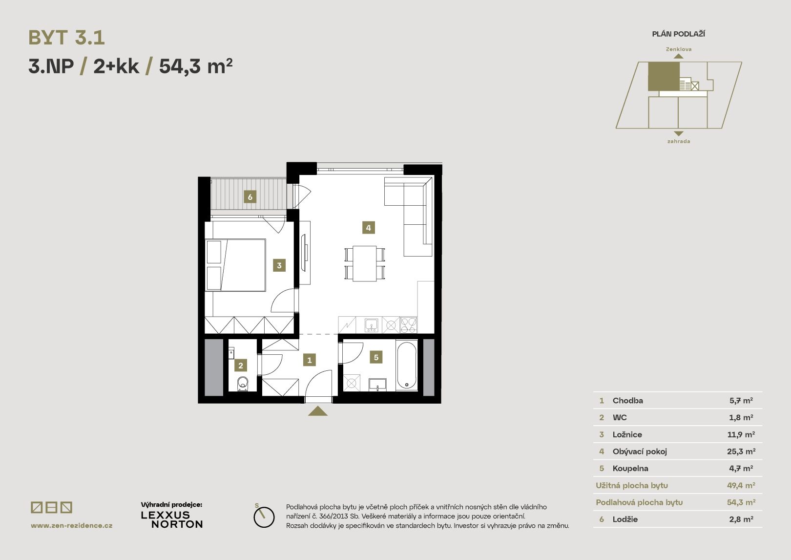 We offer a modern single-bedroom apartment with a total area of 54.3 sqm, located on the 3rd floor of the prestigious ZEN Rezidence project in Prague's Liben. This apartment with a north-facing loggia (2.8 sqm) and a well-thought-out layout provides an ideal combination of comfort, functionality, and stylish living close to the city center.