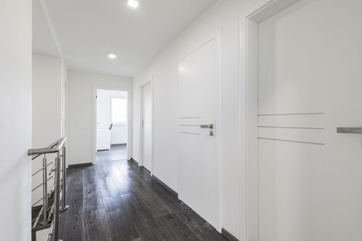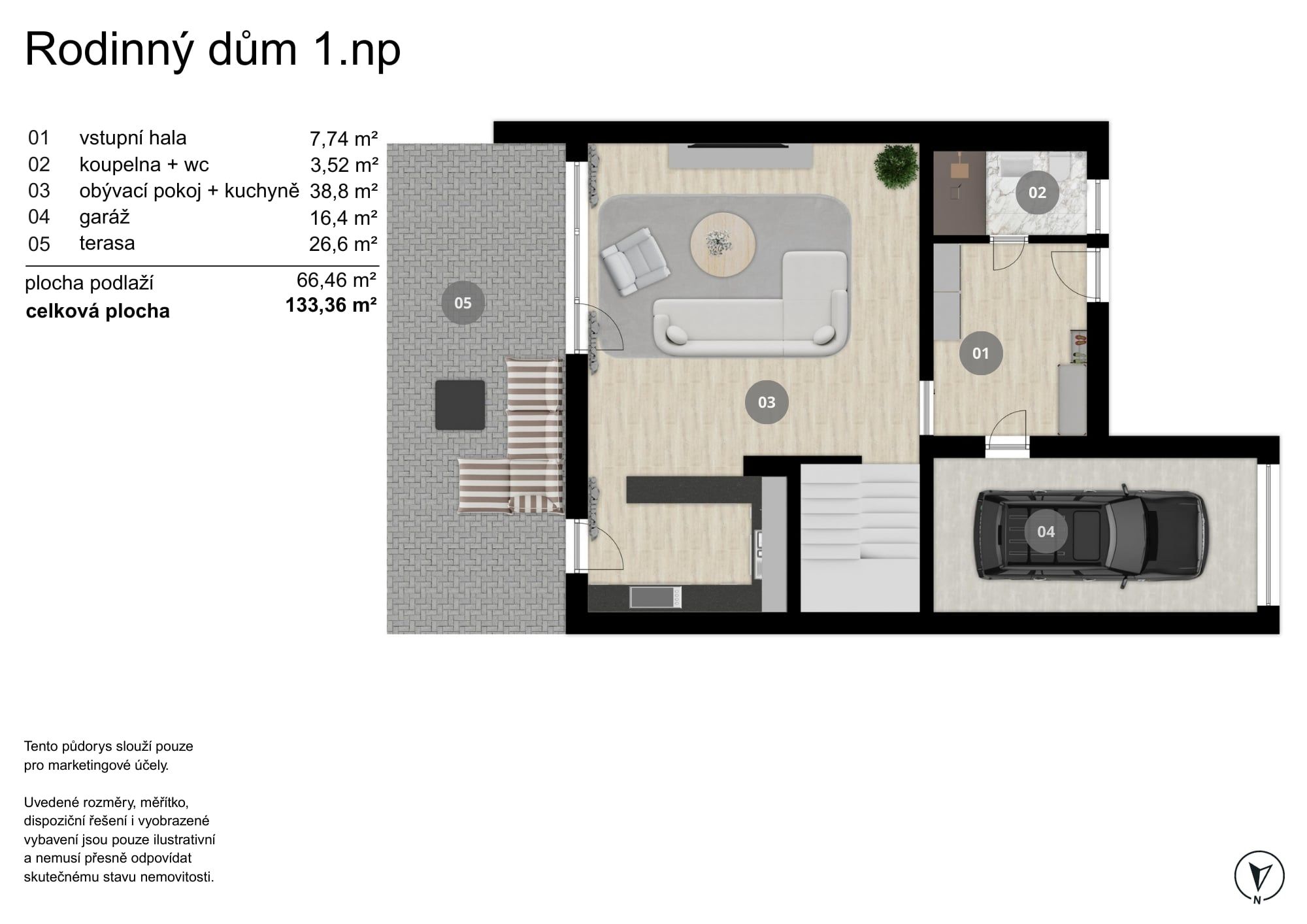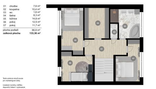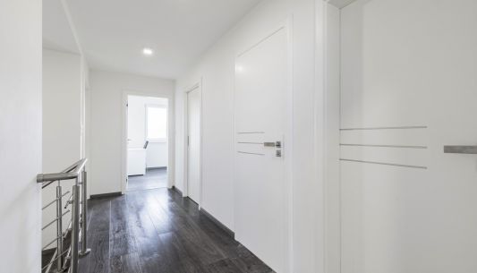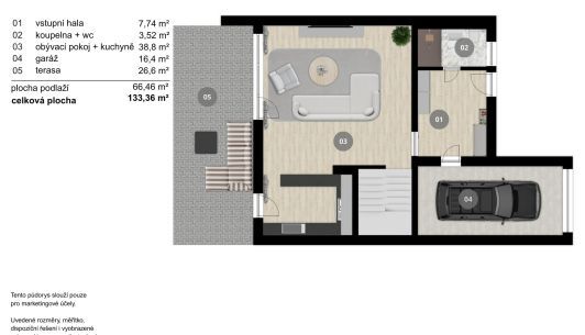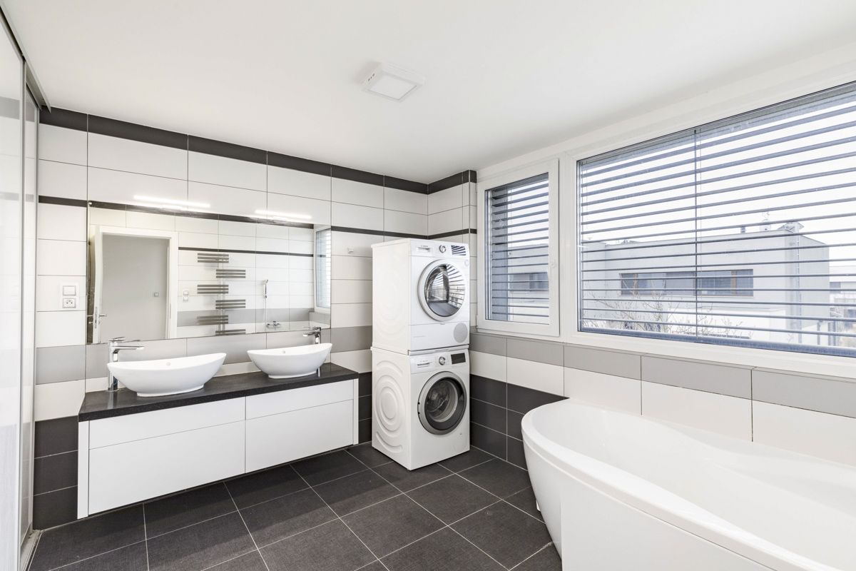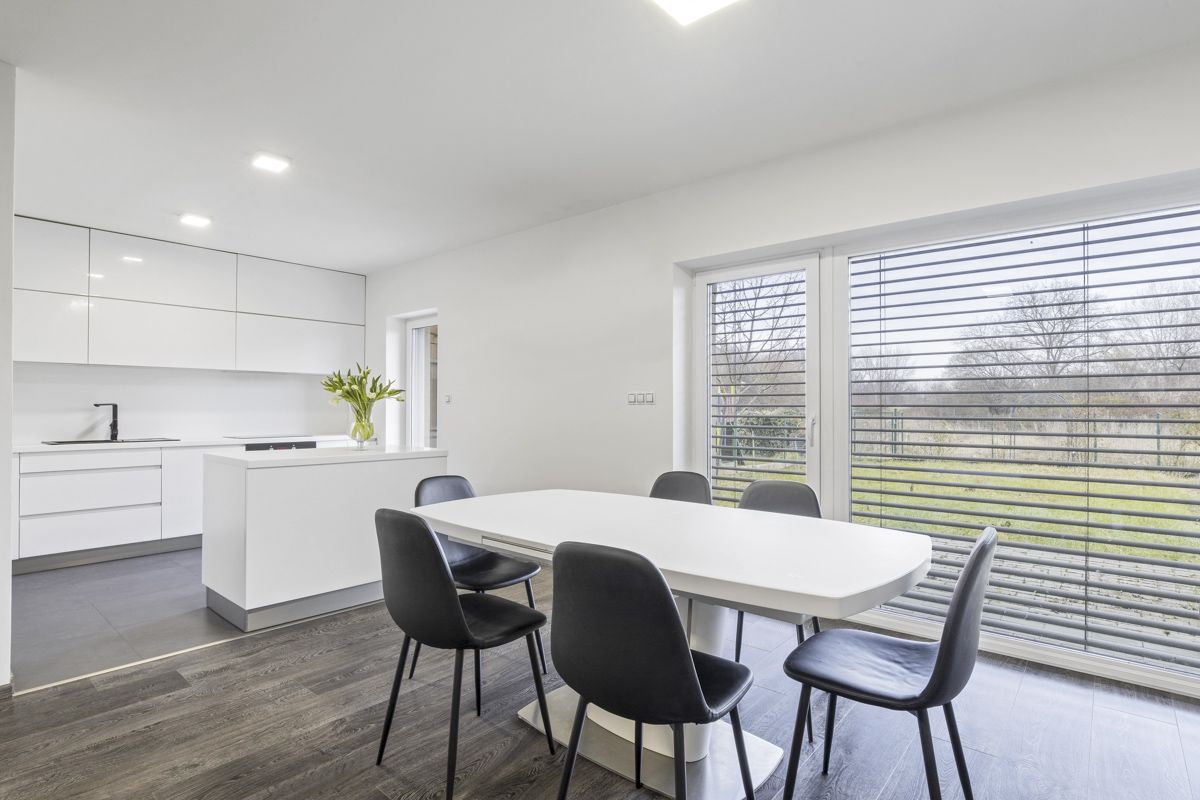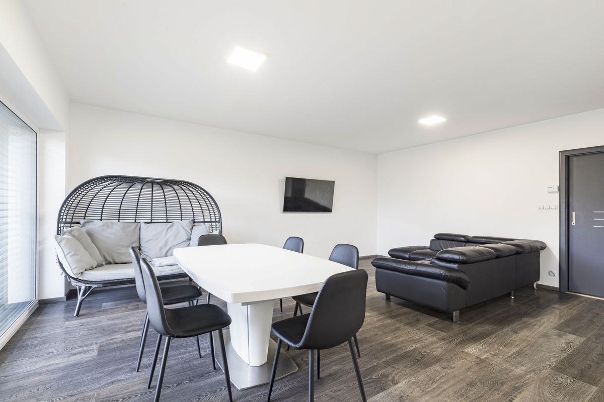 Dům je dispozičně řešen jako 4+kk, dominantou bytu je světlý a velký obývací pokoj s výstupem na terasu a zahradu s výhledem do zeleně. Dále spodní koupelna, z chodby vstup do garáže. Prostorná chodba s maximálním využitím pro vestavěné skříně; v patře jsou tři pokoje, velká koupelna s vanou a prostorná zařízená šatna. Parkování v garáži a další místo je před domem. Pro svoji polohu je vhodný i na investici a pronájem.