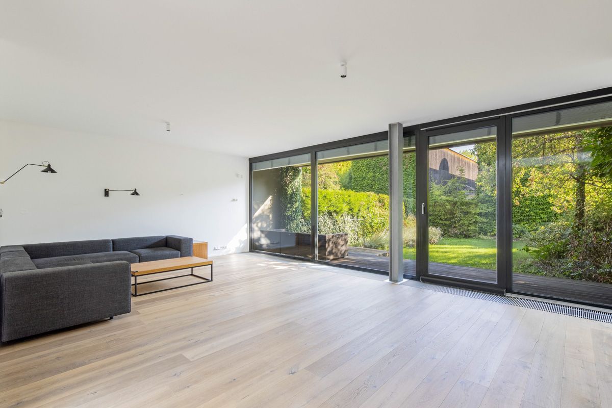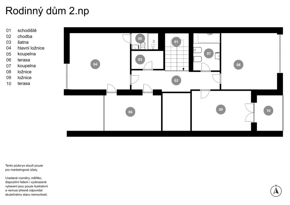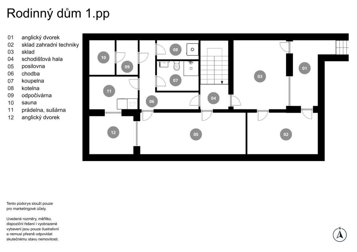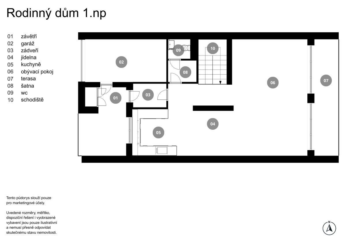 Vila je řešena ve třech úrovních. Vstup v přízemí nabízí závětří, chodbu v zádveří a navazující šatnu a toaletu. Dále se otevírá rozlehlý obývací pokoj, jehož prostor je umocněn celou prosklenou stěnou a pohledovým propojením na obytnou zahradu s terasou. Plynule navazuje jídelní část s plně vybavenou kuchyní a průhledem do patra vily. V patře jsou umístěny tři ložnice, dvě koupelny a šatna. A je zde přístup na západně orientovanou terasu. Suterén je plně využit k obytným účelům. Jsou zde umístěny herna, fitness, malý kinosál s krbovými kamny, šatna, koupelna, sklad, prádelna a místnost pro plynový kotel. Je zde i zadní přístup na zahradu. K dispozici je příprava na saunu. Místnosti v suterénu mají okna umístěná do anglických dvorků. Ze závětří je pak vstup do garáže.