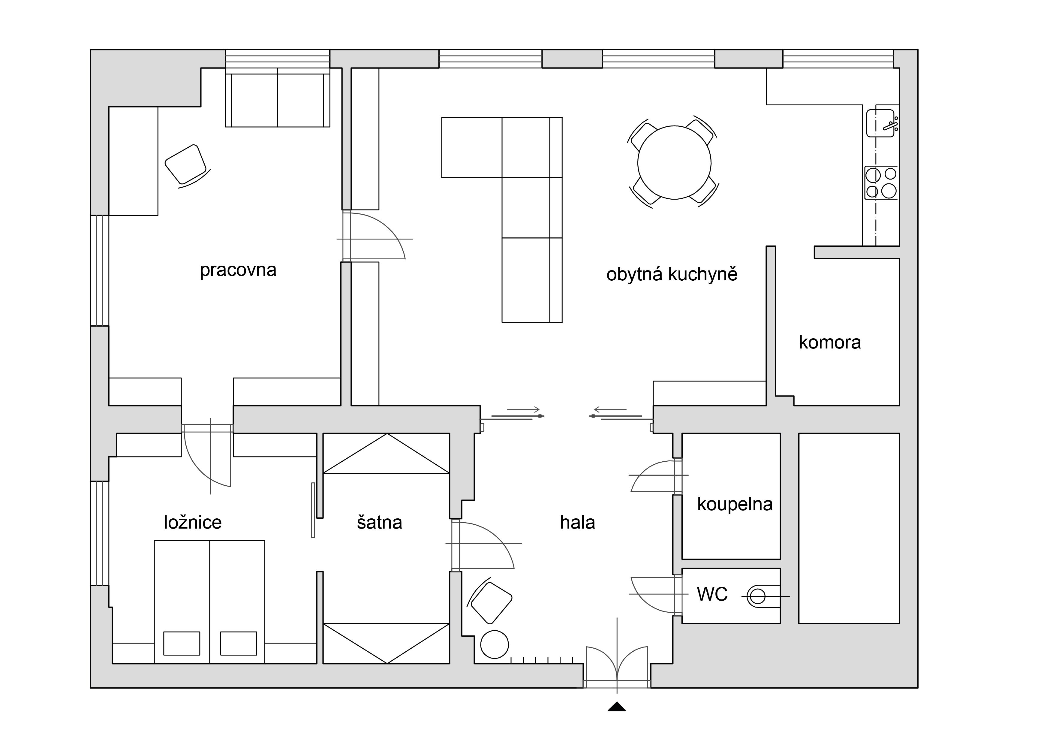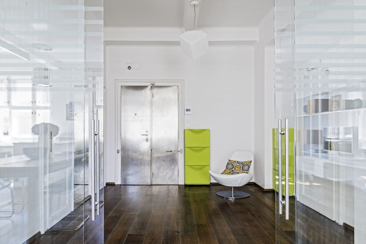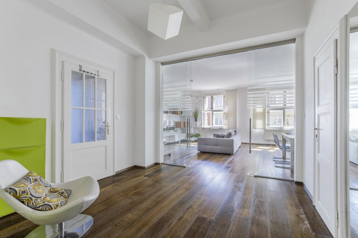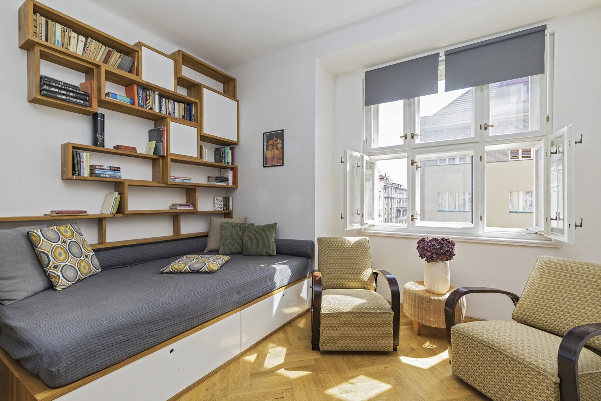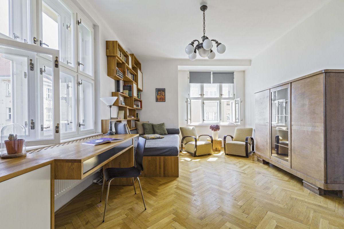 From the spacious entrance hall there is access to all main parts of the apartment - to a generous kitchen with a dining area and a living area oriented to the street, to a bathroom with a shower and sink, separate toilets and a dressing room. A practical storage room is connected to the kitchen. The bedroom is situated in the Puškinova Square park. The second corner room (currently used as a study) is accessible from the living area and also faces Puškinovo náměstí and Eliasova Street.