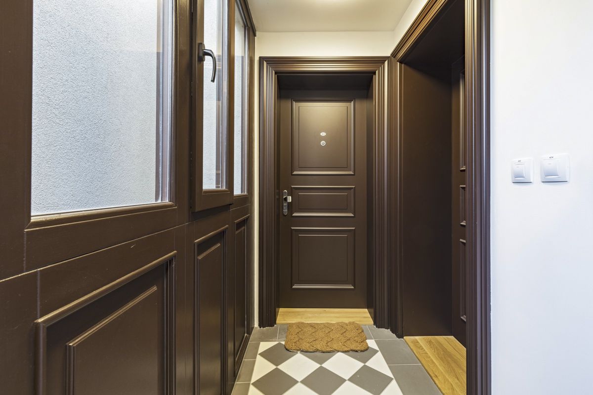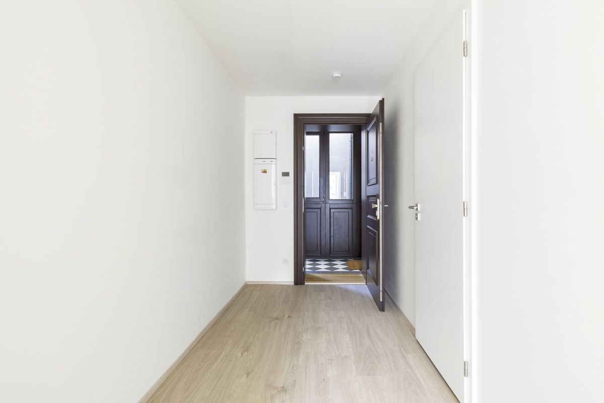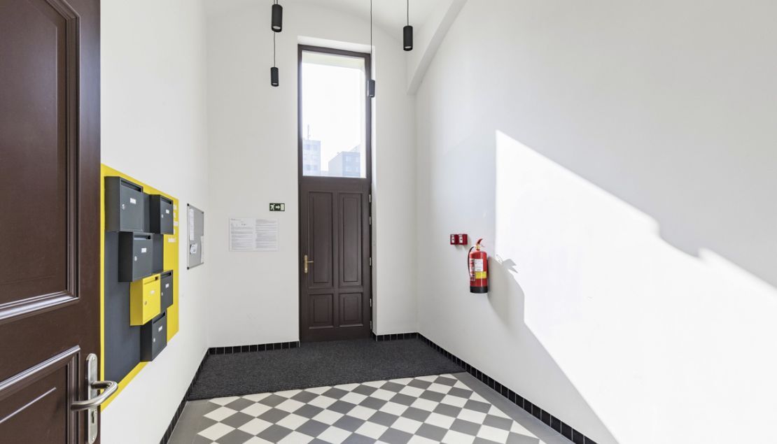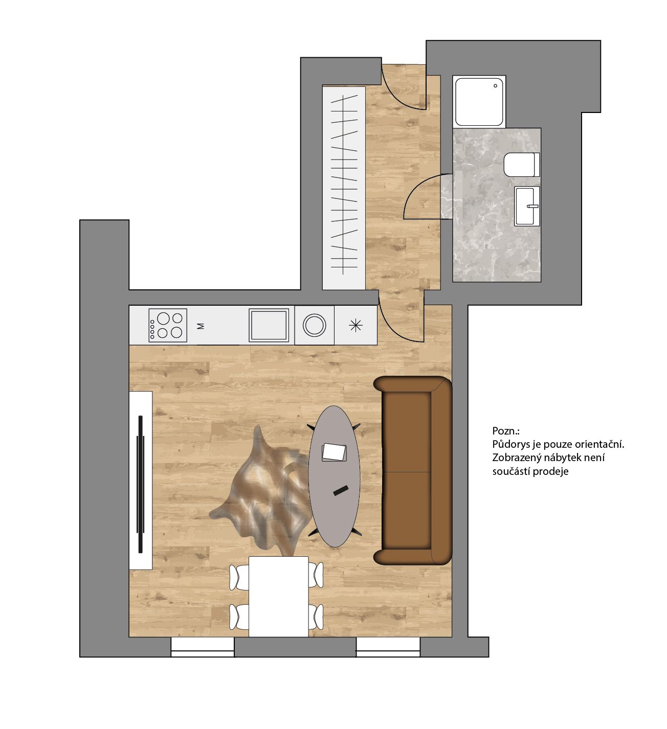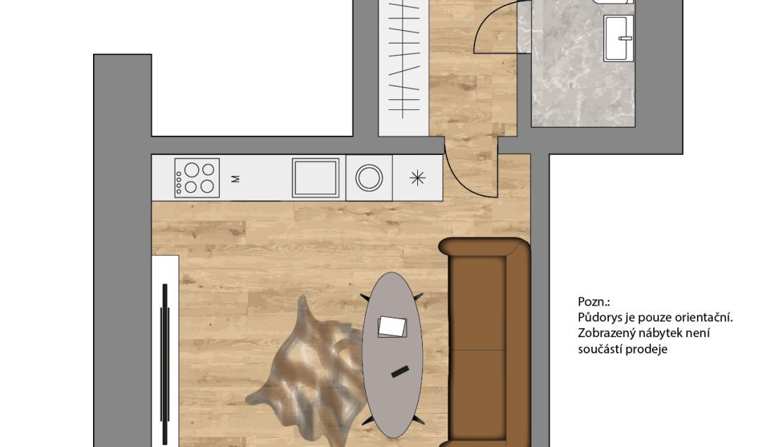 Bytová jednotka 1kk disponuje velkorysým otevřeným pravidelným prostorem s přípravou pro kuchyňskou linku. Vstupní chodba je uzpůsobena pro umístění vestavných skříní s dostatkem úložného prostoru. Velká koupelna má samostatný vstup z chodby a je zde sprchový kout, umyvadlo, toaleta a prostor pro pračku a sušičku.