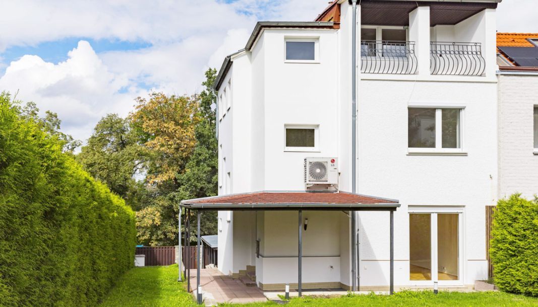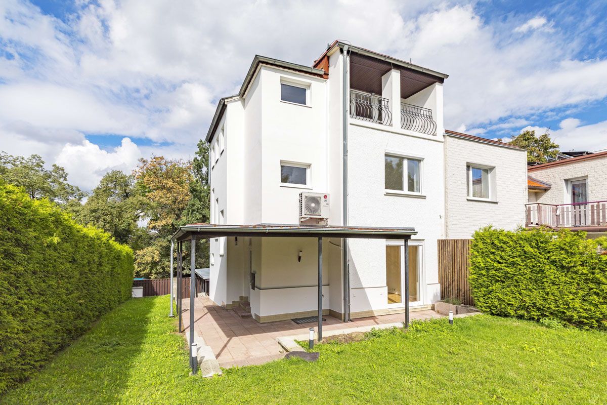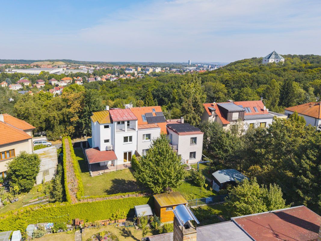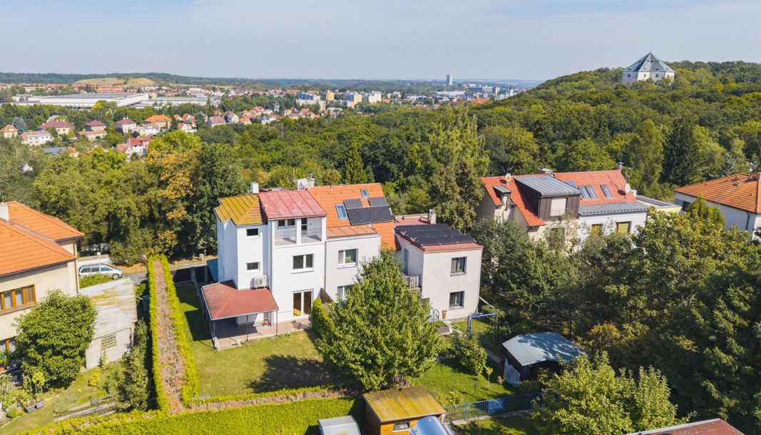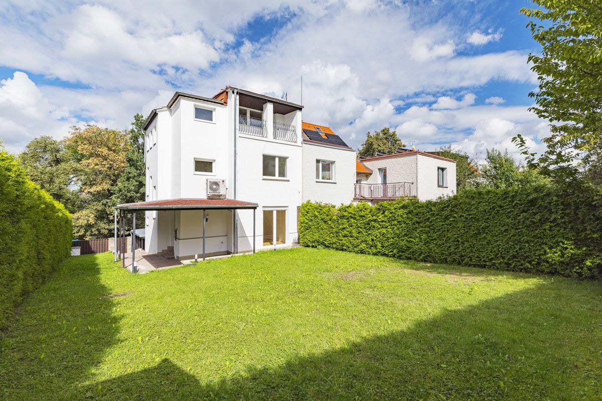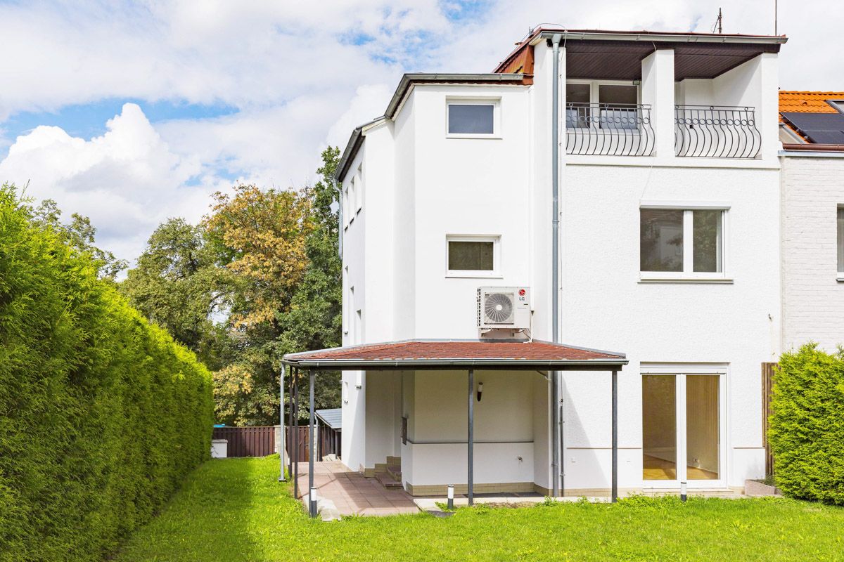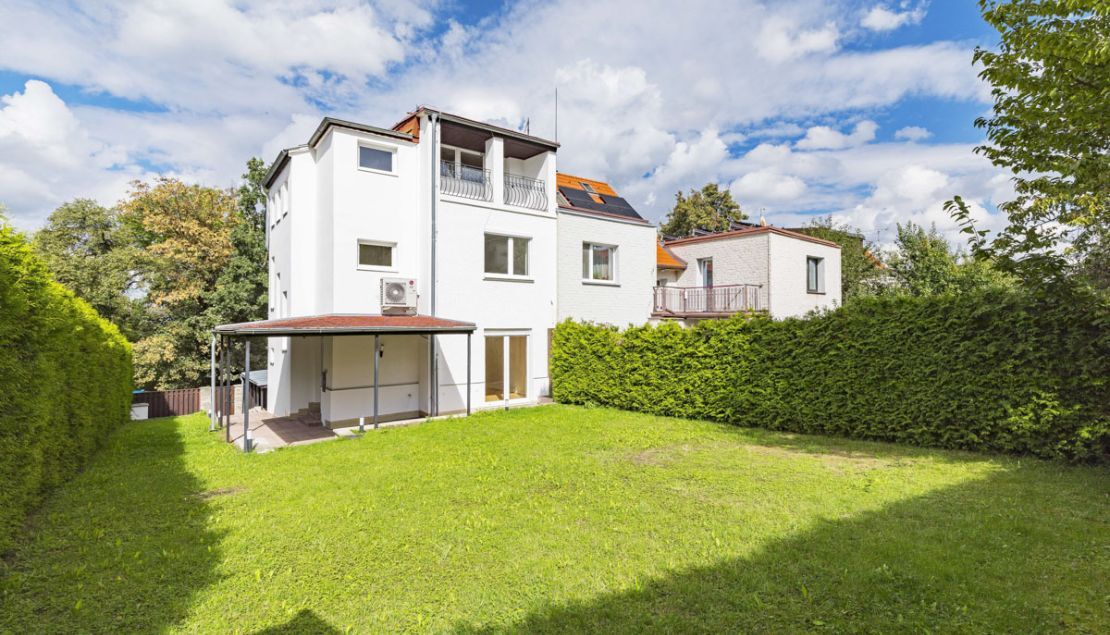 Jedná se o polovinu dvojdomu původně z meziválečných let, která prošla nedávno kompletní rekonstrukcí. Dům obsahuje vnitřní dispozici 4+1 se suterénem rozmístěnou do třech nadzemních podlaží a jednoho podlaží podzemního. V úrovni 1. NP se nachází vstup ze zahrady, za kterým je rozložen obývací pokoj s francouzským oknem orientovaným na jih do zahrady a samostatná kuchyň a jídelna. V prvním patře nalezneme dvě ložnice, každá propojena s vlastní koupelnou. Celé 2. NP je koncipováno jako rodičovské. Nachází se zde velká ložnice o rozměru 40 m2, koupelna a šatna. Ložnice v tomto patře je vzhledem k chodbě umístěna tak, že ji lze případně rozdělit na dvě samostatné místnosti s vlastními stupy z chodby, přičemž zůstane zachován dostatečný velikostní komfort všech místností. Suterén domu je využíván jako technicko-skladovací zázemí objektu a je zde umístěna vnitřní garáž. Druhé parkovací stání je vybudováno jako vnější, kryté pergolou a umístěné vedle vjezdu do garáže. Zahrada je řešena pouze jako zelený trávník, avšak je po celém svém obvodu plně osázena živým plotem s výškou zamezující pohledu ze sousedních zahrad. Na kraji terasy přiléhající k domu jsou připraveny inženýrské sítě pro budoucí instalaci bazénu.