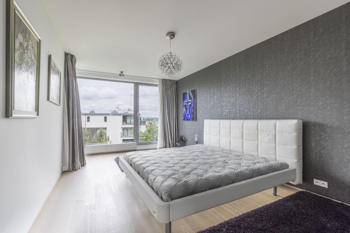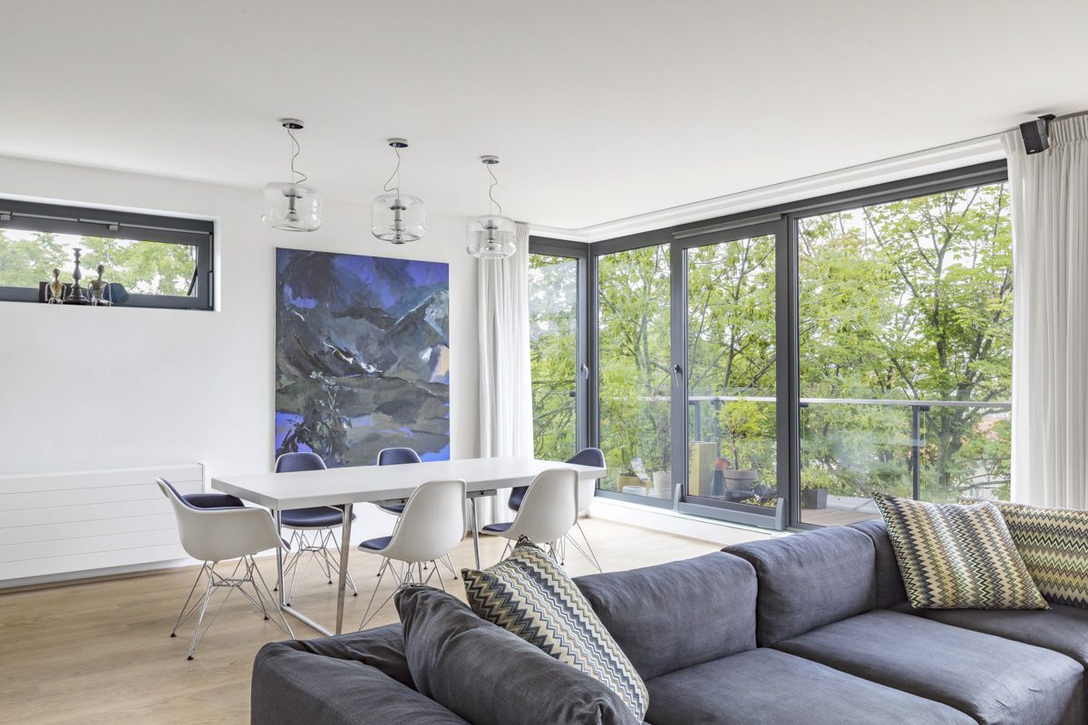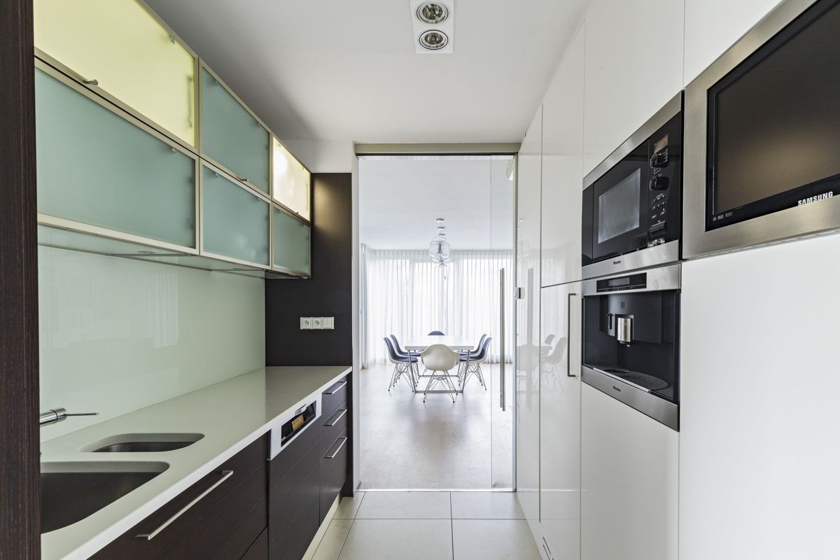 Upon entry, you are welcomed by a spacious hallway with built-in wardrobes that naturally connects to the open living space. The dominant feature of the apartment is the impressive living room with dining area, terrace, and open view of the city and greenery. Thanks to the west-facing terrace, you enjoy plenty of light year-round, enhanced by large-format windows. The kitchen is separate with a window, fully equipped with Miele appliances, and has practical access to the dining area. In the hallway, you will find a bathroom with a shower and toilet.