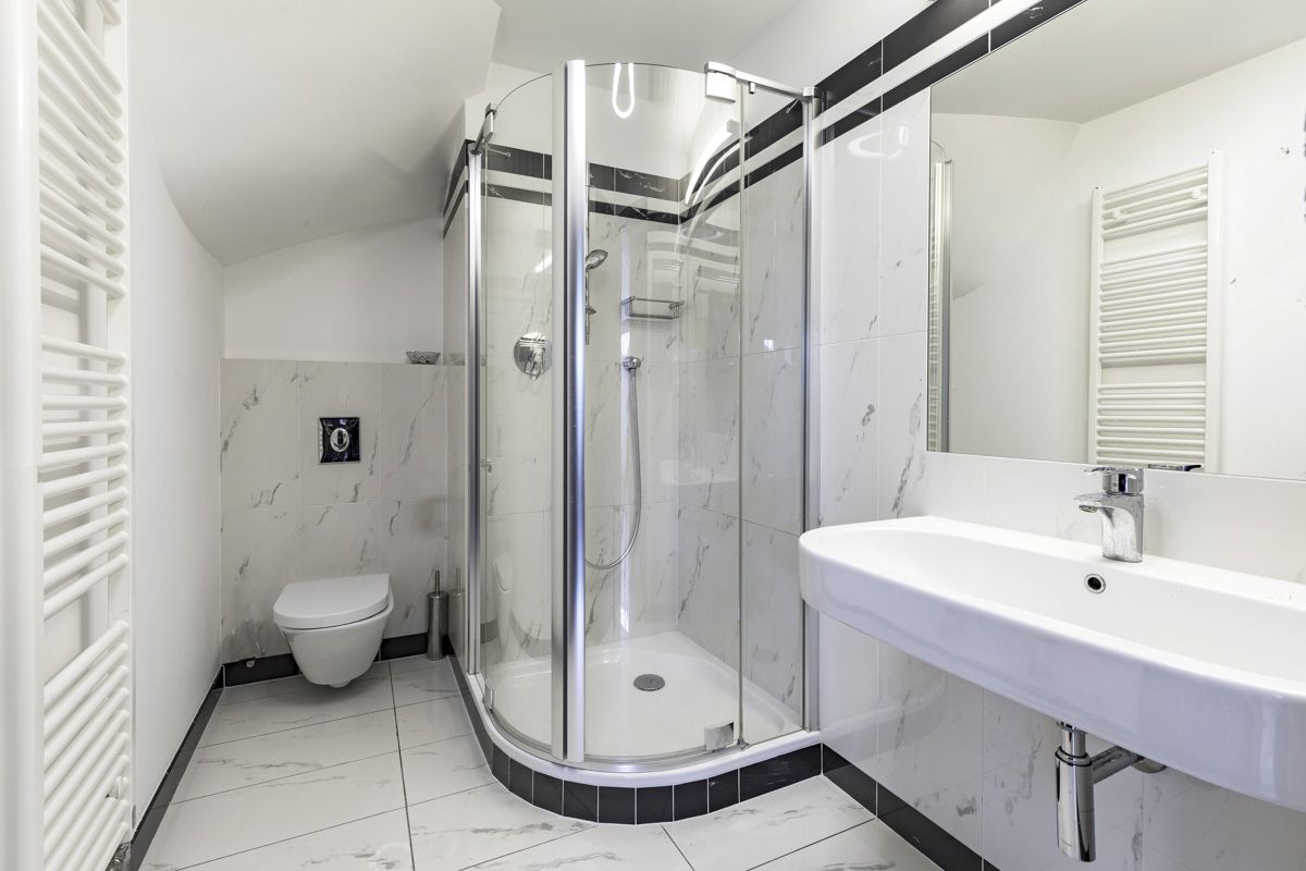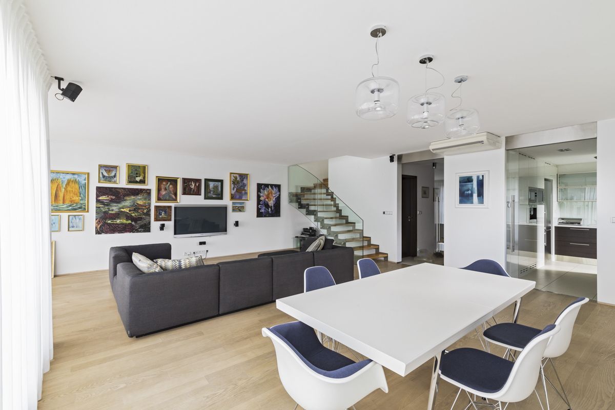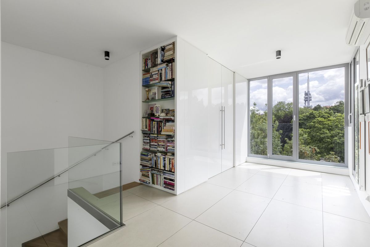 A modern staircase in the living room connects the apartment to the upper floor with two bedrooms, a bathroom, and a living hall with a view of Riegrovy sady and the Zizkov TV tower. Off the hall, there is a balcony, and the space could potentially be converted into a third bedroom. The bathroom is spacious enough to accommodate a washing machine and dryer.