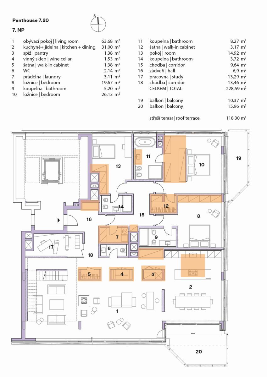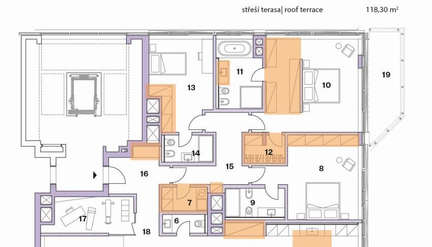 Moderní byt s výjimečnou střešní terasou se nachází v 7.nadzemním podlaží. Terasa bytu s vířivkou nabízí panoramatický výhled na město. Byt samotný je v jedné úrovni, obývací a společenská část je velkorysá, orientována na jih, s výhledem do zeleně. U kuchyňské a jídelní části je prakticky navazující terasa, dostatečná pro běžné stolování nebo posezení s rodinou, či přáteli. Zajímavým prvkem bytu je prostor u vstupní haly s vysokým stropem a působivým schodištěm ke střešní terase, a to díky velkoformátovému střešnímu oknu o velikosti 37,7 m2. Další část bytu pokračuje třemi samostatnými ložnicemi s vlastními koupelnami. Praktickou část bytu doplňuje samostatná toaleta u vstupní haly, technická místnost a také samostatná místnost pro domácí vinotéku.