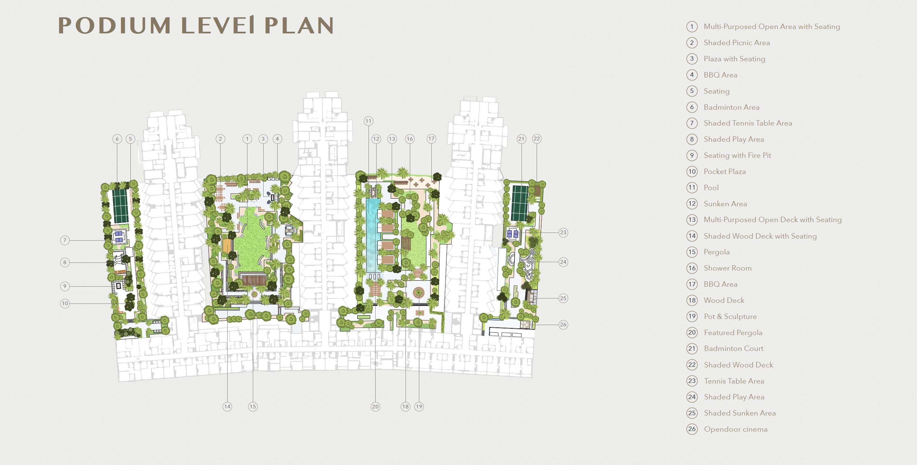 Přízemní část komplexu překypuje lákavými možnostmi pro rezidenty i hosty – od vybraných restaurací světové gastronomie přes nákupní příležitosti až po venkovní stravování, krystalově čistý bazén, profesionálně vybavenou posilovnu, luxusní spa s jóga studiem a stylový coffee bar. Projekt dále přináší multifunkční otevřené plochy s odpočinkovými zónami, stinné piknikové kouty, reprezentativní náměstí s posezením, grilování pod širým nebem, badmintonové hřiště a dokonce i open-air kino pod hvězdami. K dispozici jsou také relaxační bazénové plochy, elegantní dřevěné terasy a rozmanité sportovně-odpočinkové zóny.