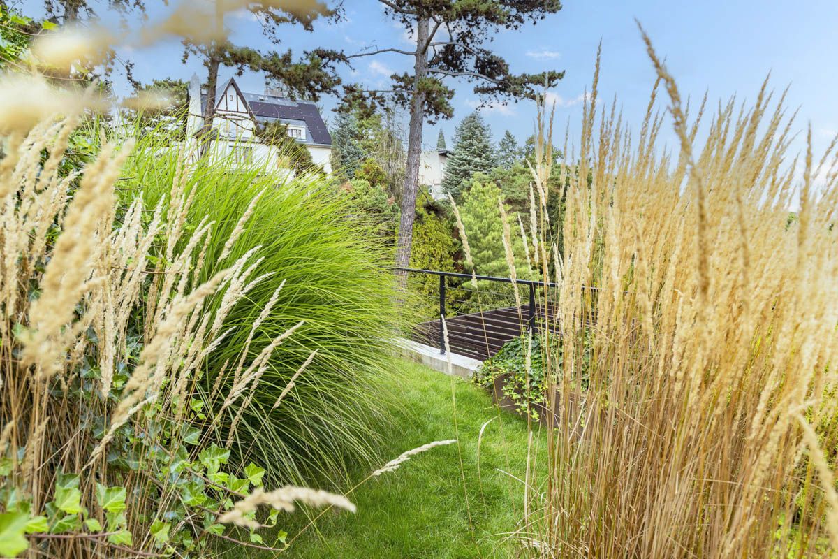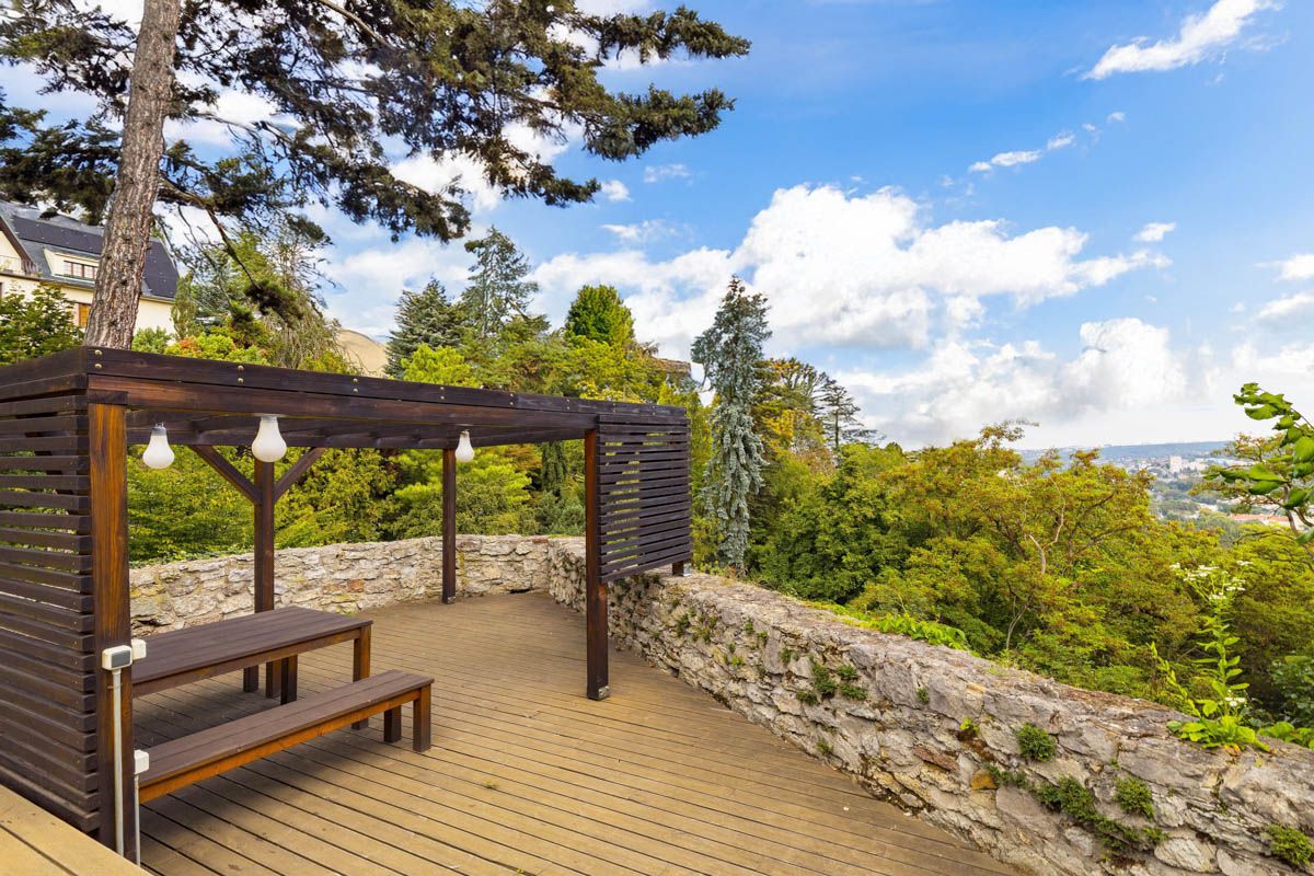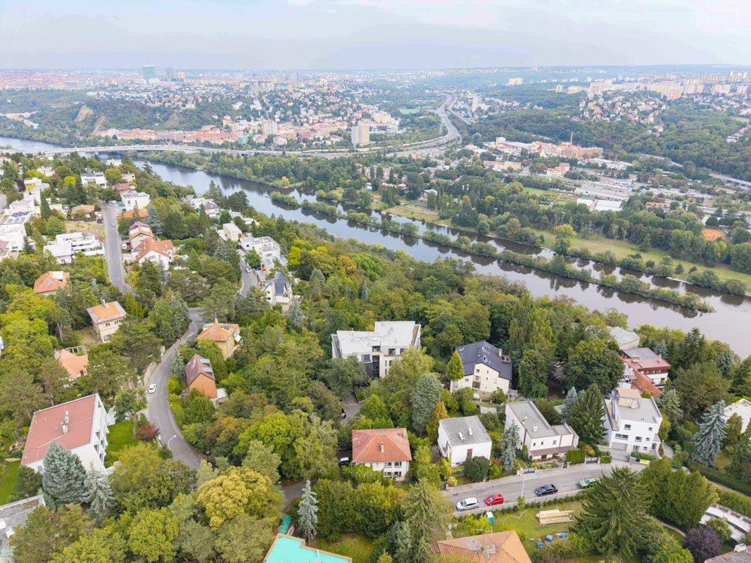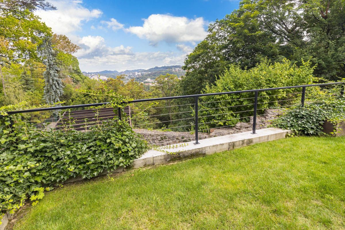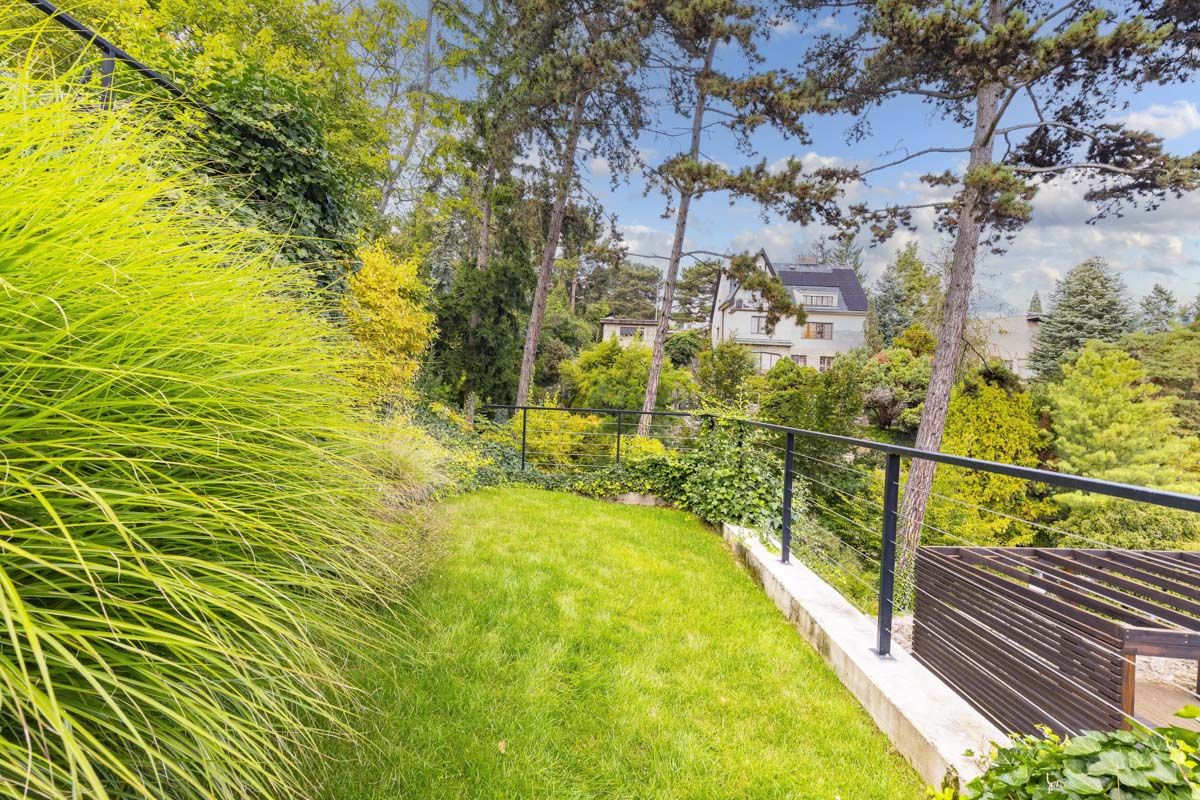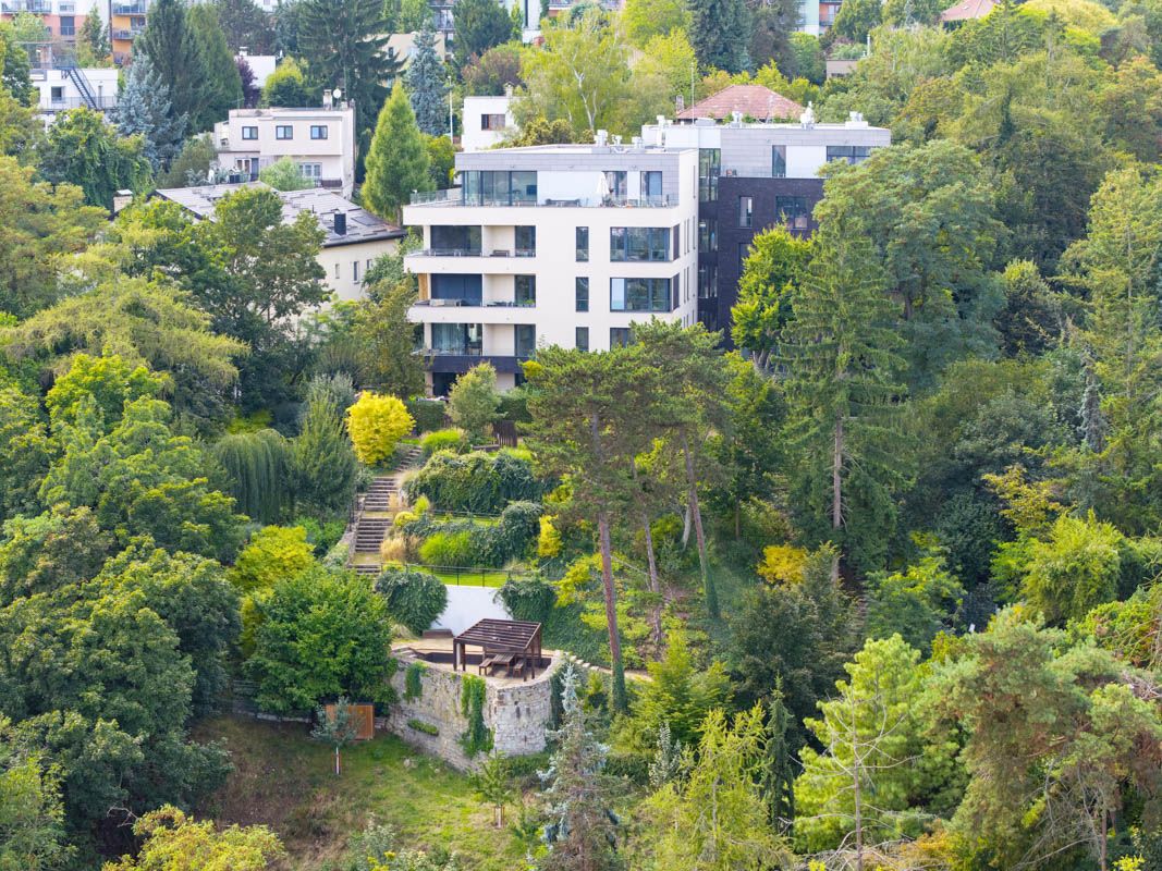 The Barrandovská zahrada residence combines modern architecture with the benefits of family living. Residents have access to a large private area with mature trees, gardens, a playground, a pergola overlooking the Vltava valley, and a communal fireplace.