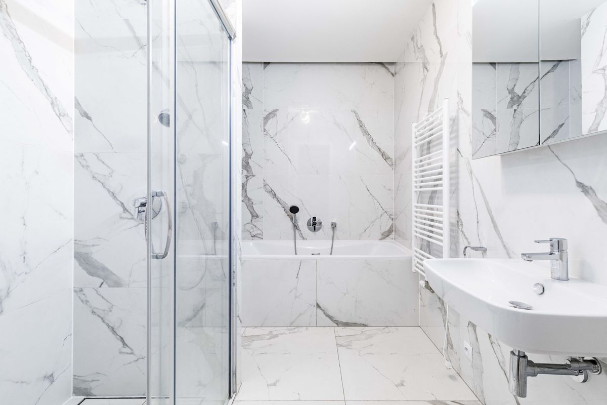 The apartment is fully furnished with custom-made furniture and offers a high standard of finish: heated three-layer wooden floors, large-format tiles in natural stone decor, flush doors, large windows, and modern design elements.