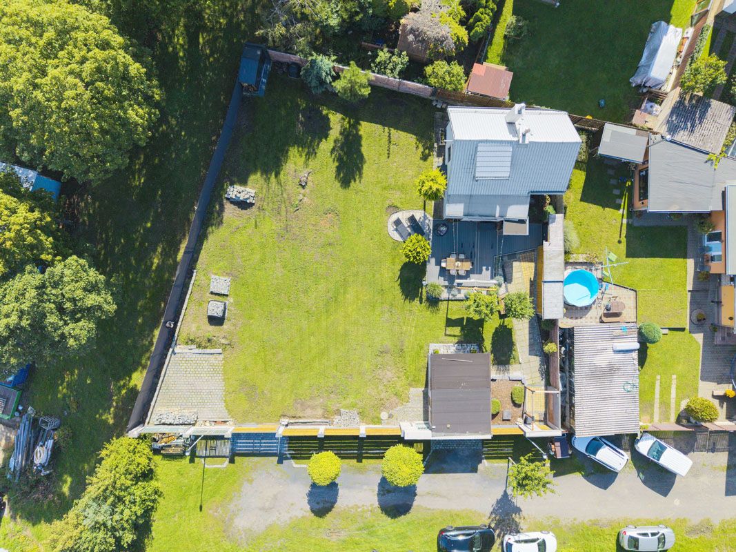 On a plot of 850 m² there is a smaller two-storey house after renovation, intended for permanent living, and a garage with access from the street. The current 3+1 layout offers on the ground floor a kitchen, bathroom with shower, bedroom, and a living room with fireplace. In the attic there is a bedroom with a view of the garden, a walk-in closet, and a utility room. A terrace with seating pleasantly connects the house with the garden. Parking is possible both in the garage and directly on the plot.