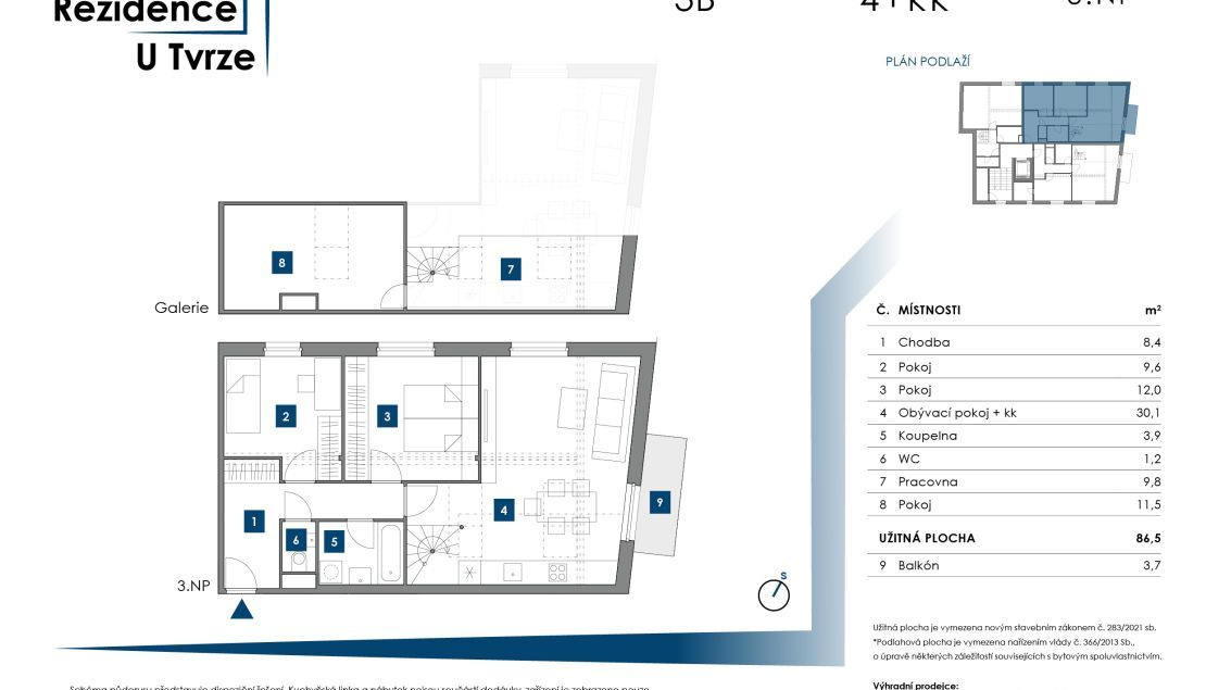 Byt 4+kk o ploše 86,7 m² s balkonem (3,7 m²), sklepem a možností garážového stání je rozložen ve 3. podlaží Rezidence U Tvrze. Komorní projekt nabízí kvalitní bydlení v klidné části Malešic s rychlým spojením do centra.