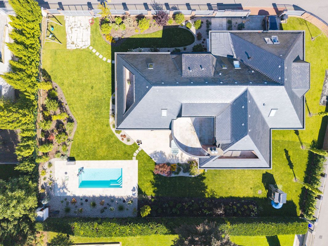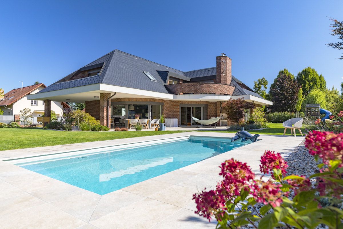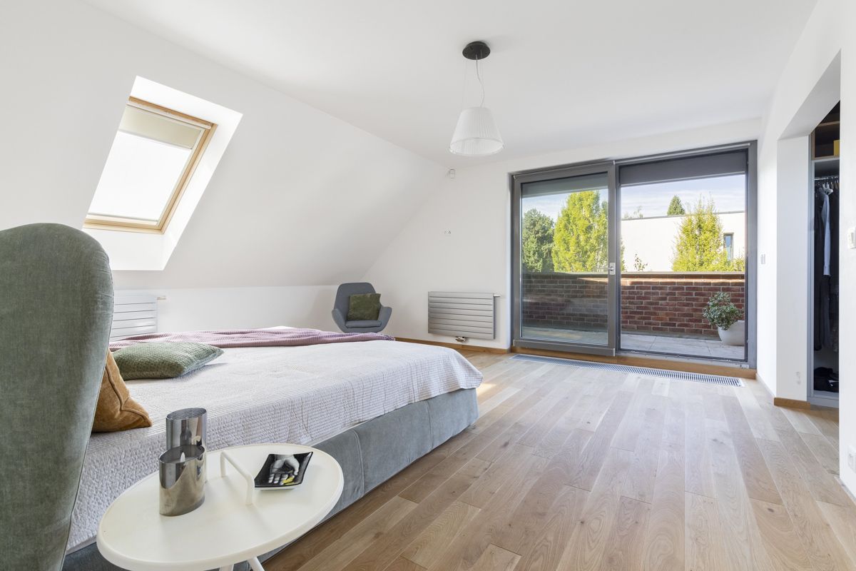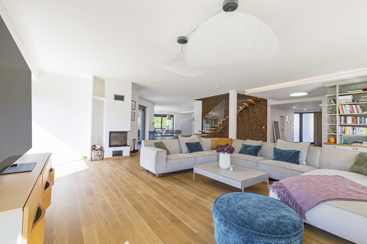 The house with a well-maintained garden and a total usable area of 360 sqm stands on a spacious plot of 1,430 sqm. On the ground floor, you will find an entrance hall, a guest room, a bathroom with a toilet, a separate toilet, a utility room, a laundry room, a pantry, and a garage. The living area consists of an open and airy living room with fireplace, which connects to the dining area and kitchen with a central island with a built-in hob. This area has direct access to a large outdoor terrace with an area of 100 sqm, which connects to a well-maintained garden with an outdoor saltwater swimming pool (3.4 x 7.2 x 1.4 m) with counter-current and heating. The garden is equipped with a Hydrawise irrigation system that draws water from a retention tank.