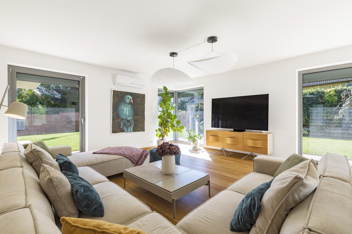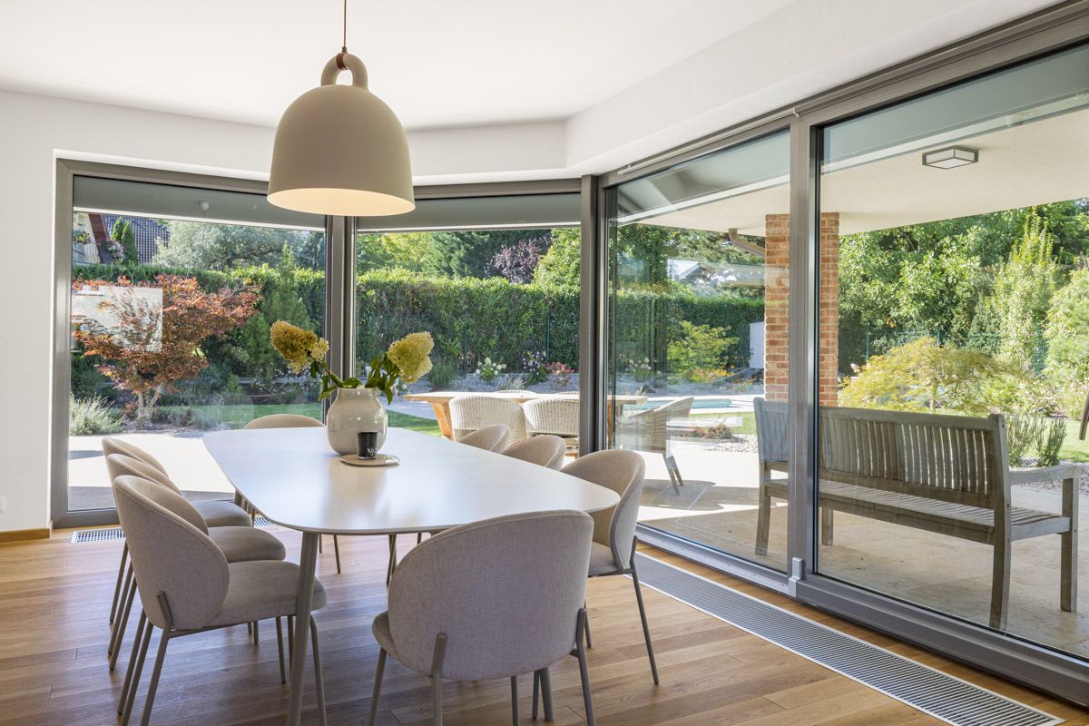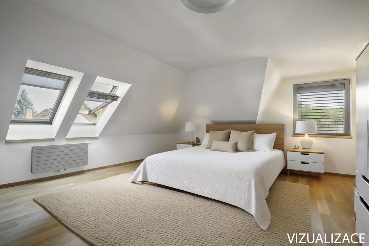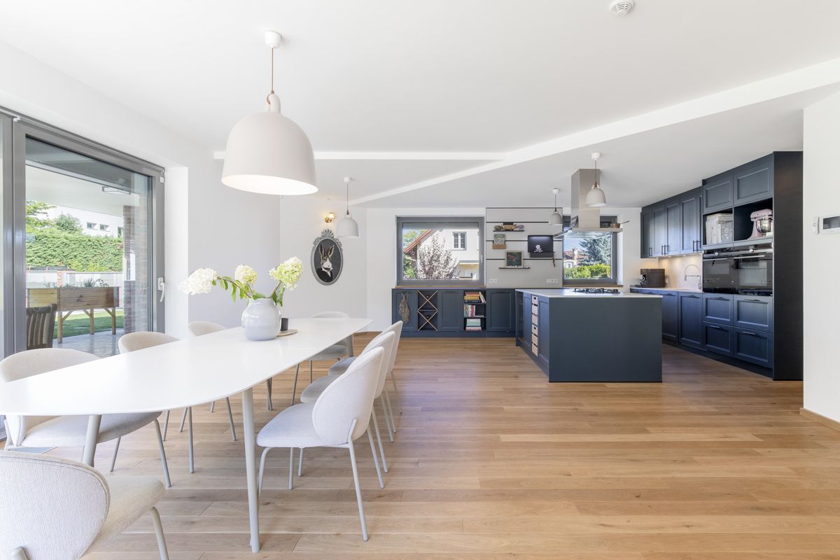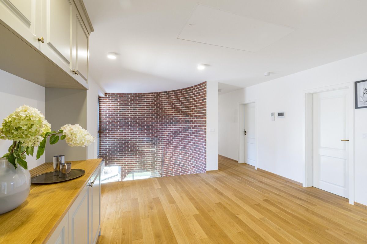The house was purchased as a shell and all technical systems were newly built in 2023. The interior design emphasizes design, quality, and functionality. The property is equipped with aluminum windows with double glazing and external blinds, custom-made security doors, and three-layer oiled oak floors complemented by underfloor heating. LG units provide air conditioning in every living room. The kitchen from renowned German manufacturer Schüller is fitted with a Technistone stone worktop and equipped with Siemens appliances from the Studioline series. The bathrooms feature high-quality Laufen sanitary ware, complemented by elegant Hansgrohe faucets and stylish Zehnder radiators, with Italian-made wall and floor tiles. All electrical appliances and controls are connected to a smart home system and can be conveniently controlled via a mobile app. Security is provided by the Jablotron system, which is complemented by Hikvision camera surveillance and a video intercom for convenient entry control.
