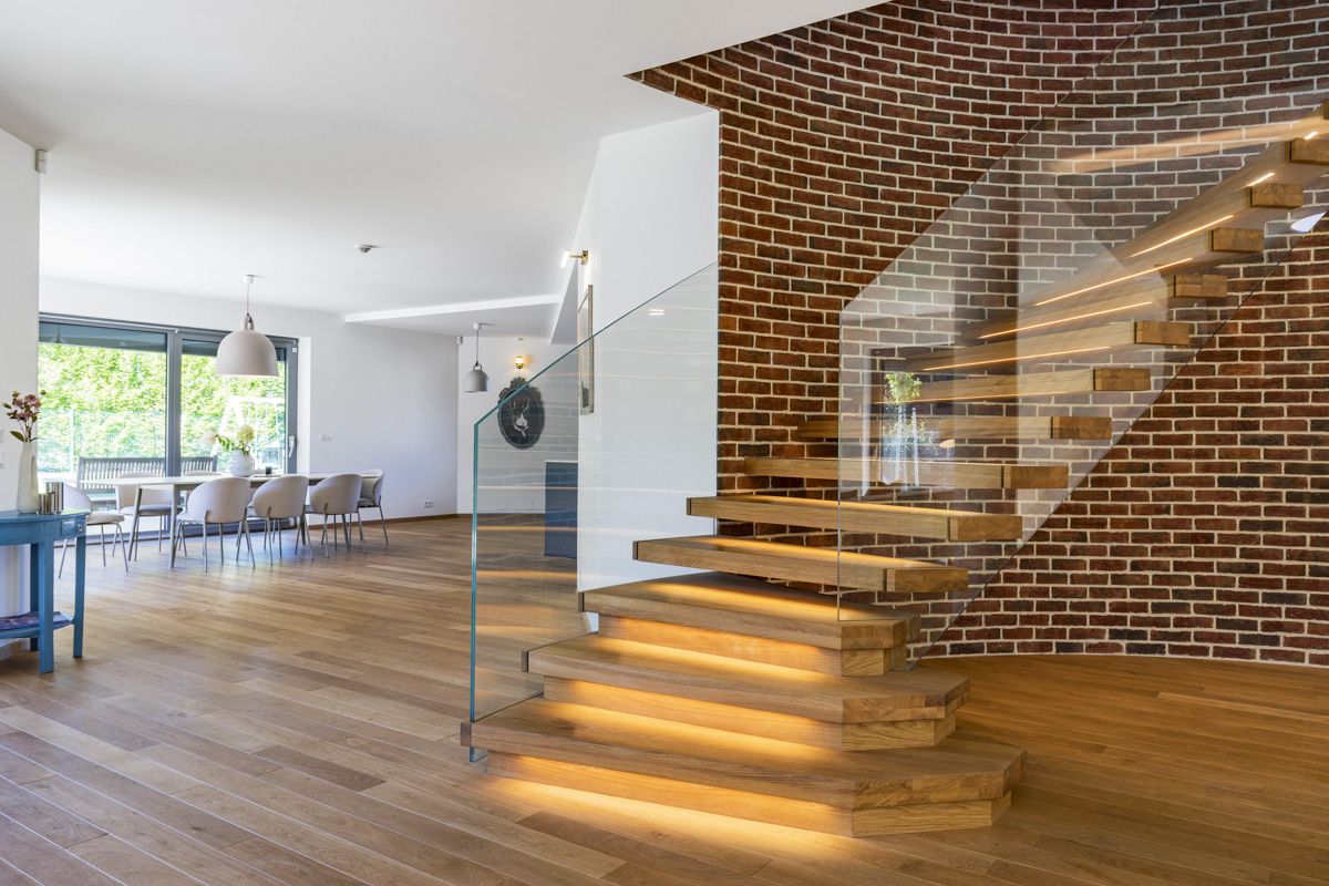 A striking arched staircase made of solid wood leads from the central part to the first floor. Upstairs there are four bedrooms, two bathrooms with toilets, a study, a dressing room, a utility room, and three terraces with a total area of 45 sqm.
