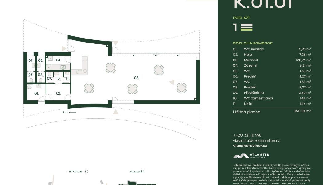 Hlavní plocha o 120,76 m² disponuje třemi vstupy a velkým prosklením se zašupovacími dveřmi, ideálními pro restauraci, bistro nebo kavárnu. Na hlavní prostor navazuje kuchyňské zázemí, technická místnost a samostatná toaleta. Provoz doplňují i dvě venkovní toalety a toaleta pro invalidy, což umožňuje plně komfortní fungování.
