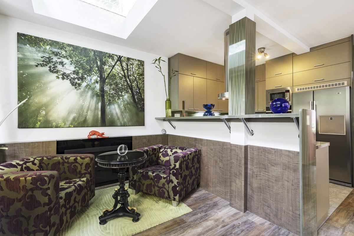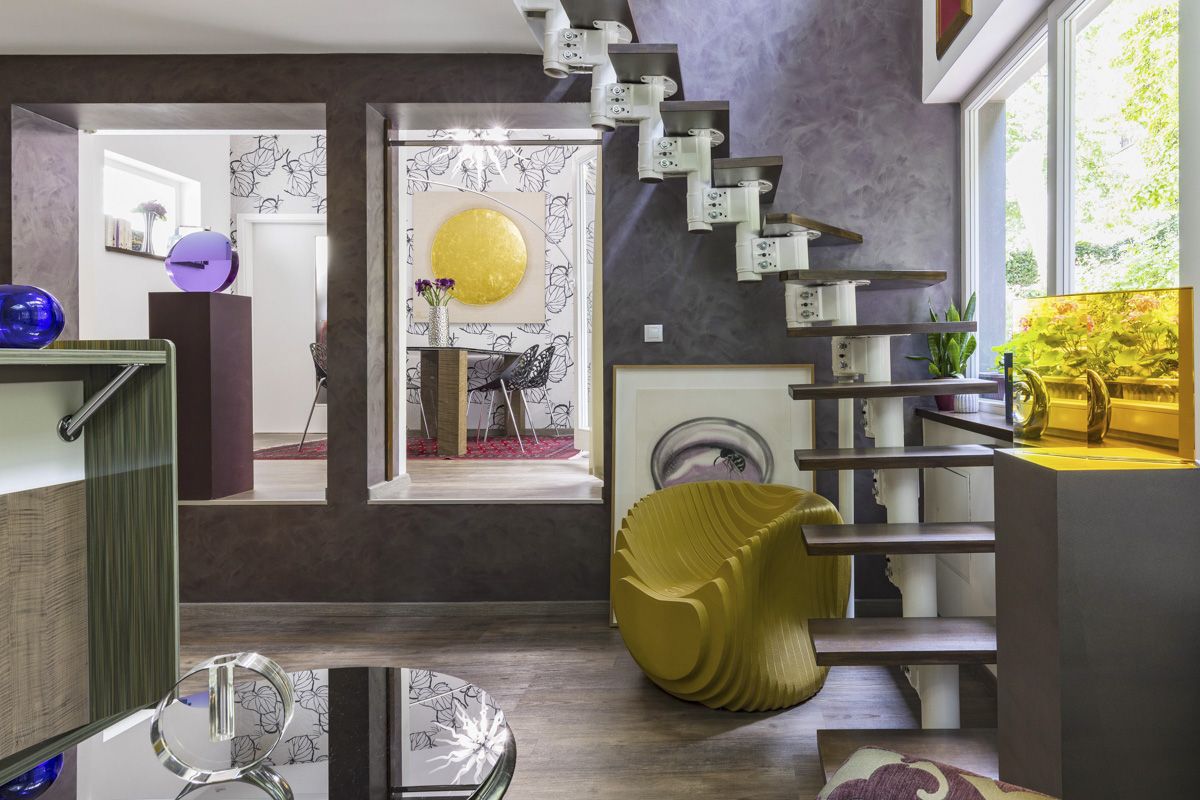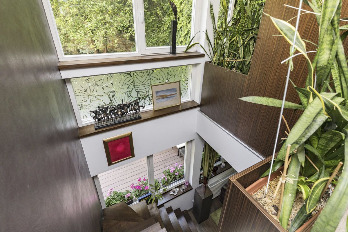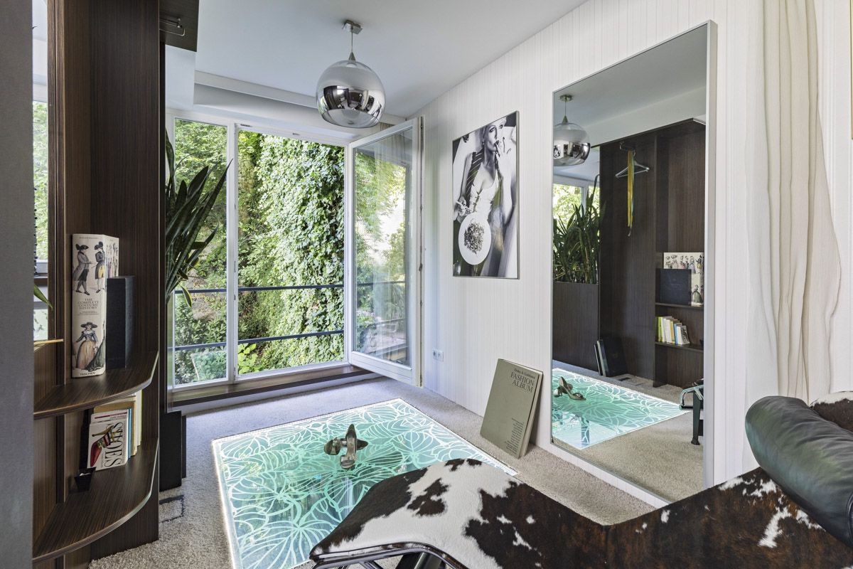 The entrance area consists of a living hall with built-in storage, followed by a walk-in closet, and a separate toilet. It continues to a fully equipped kitchen with a dining area with a bioethanol fireplace and access to the gallery, which can serve as an additional room or a workplace. Two steps higher is the living room with an access to a terrace and the garden. The various parts of the apartment are arranged over several height levels, and most of the spaces benefit from direct connection to the garden.