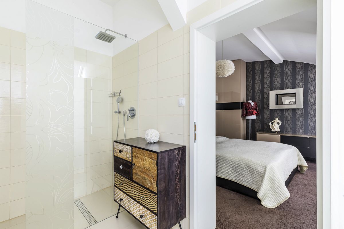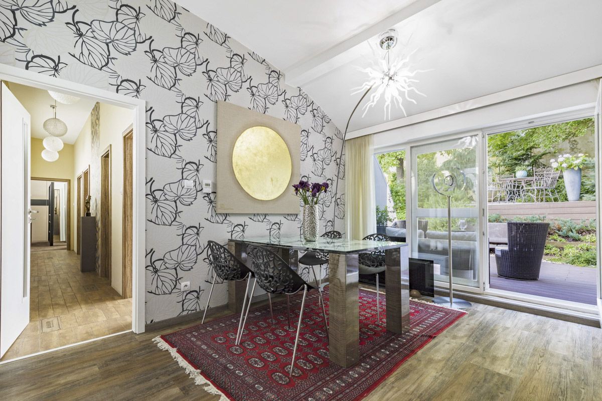 In a separate part of the apartment, there are three bedrooms, all with windows facing the garden. The dominant feature is the master bedroom with its own bathroom equipped with both a bathtub and a shower and an enclosed toilet. French doors from the bedroom lead directly to the terrace and the garden. The other bedroom is accessible from the hallway, which also leads to the second bathroom with a shower and toilet. The third room is smaller and suitable, for example, as a children’s room or workplace. From the hallway, there is also access to a utility nook for a washing machine with storage space.