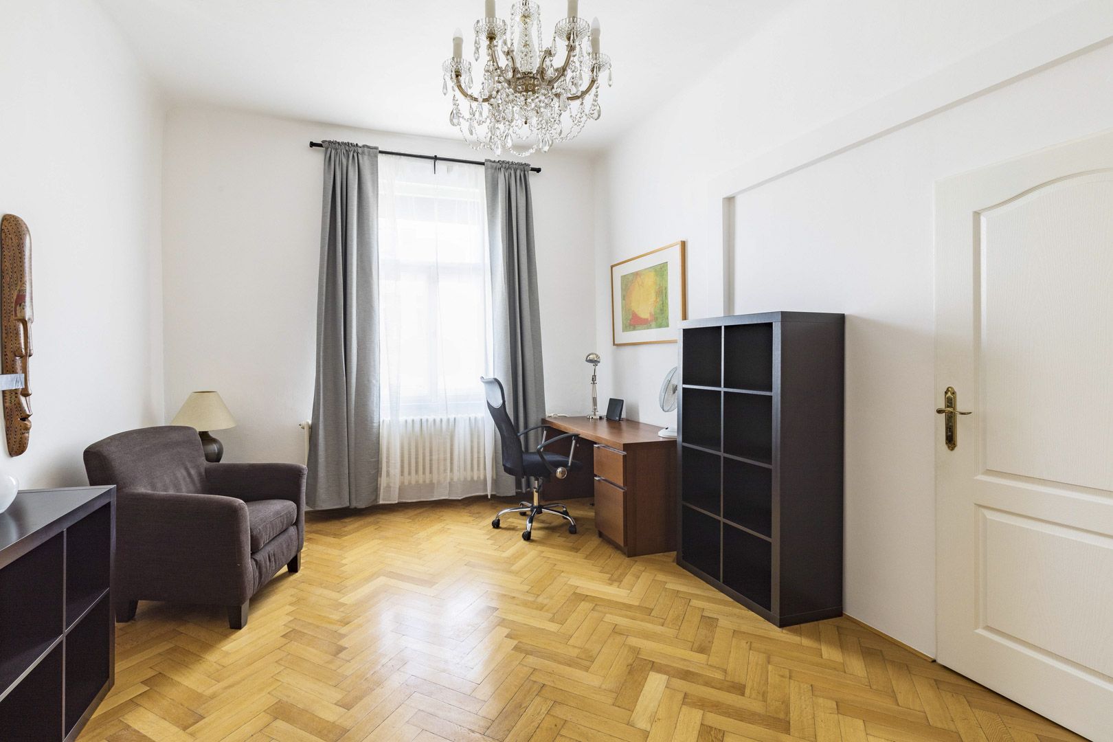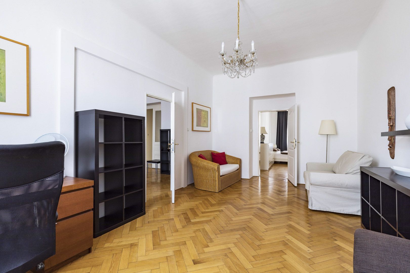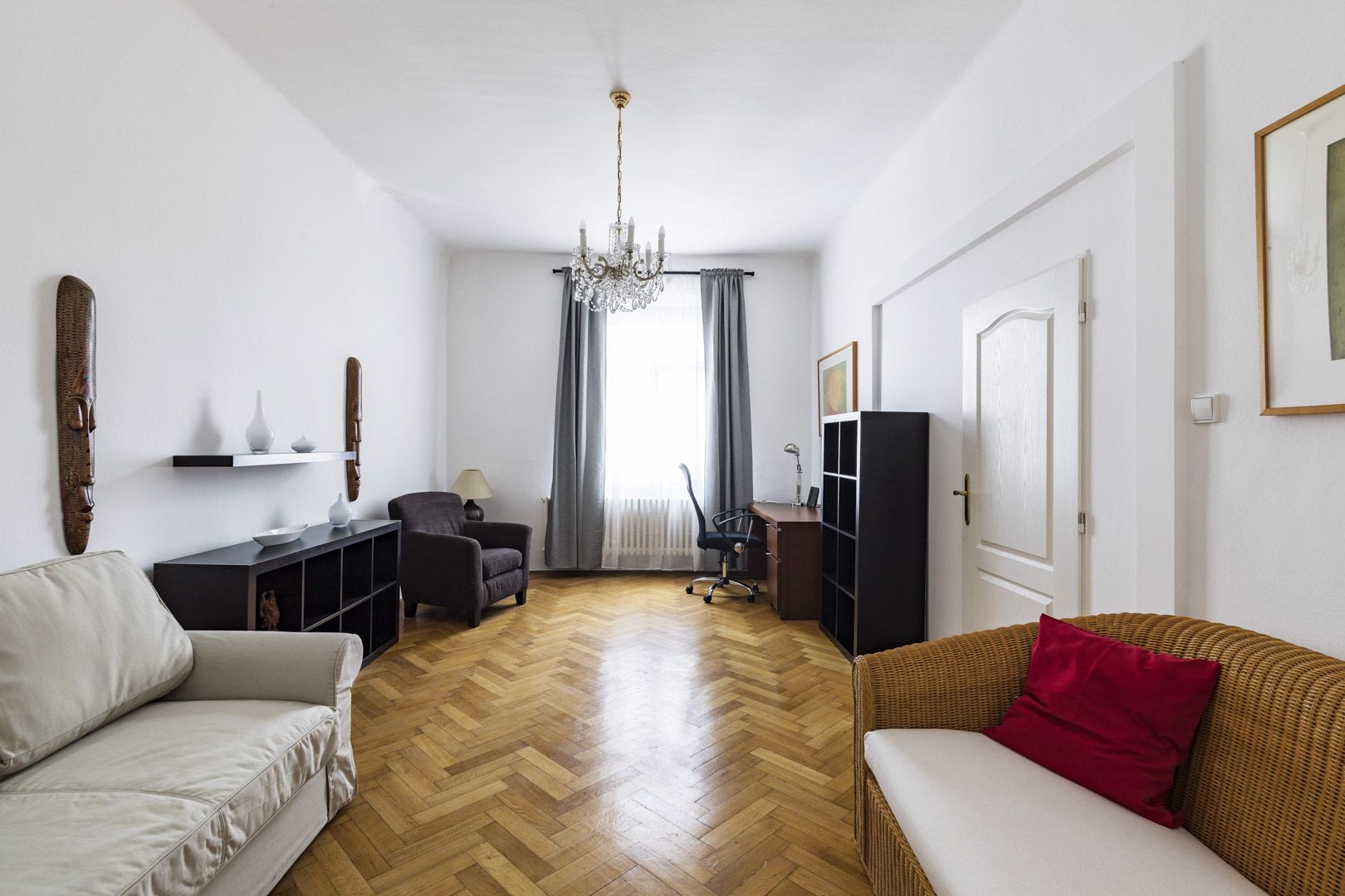 Tento zařízený byt k pronájmu dispozičně nabízí vstupní chodbu, prostorný obývací pokoj, oddělenou plně vybavenou kuchyň (sklokeramická deska, trouba, lednice, mrazák, myčka nádobí a pračka) včetně jídelní části, 2 samostatné ložnice a pracovnu. Dále jednotka nabízí k užívání koupelnu s masážní vanou a sprchovým koutem. Garážové stání za poplatek v Domě Černá Labuť.