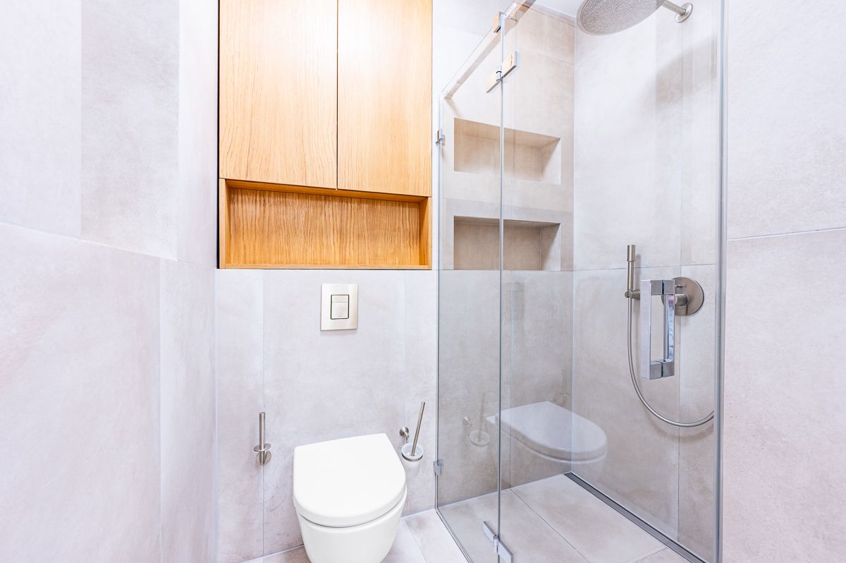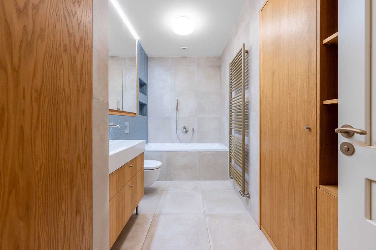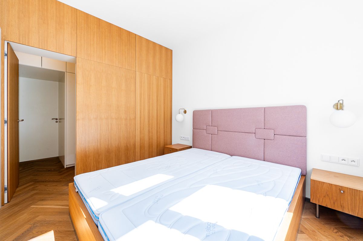 The bright and luxuriously furnished interior offers a practical entrance hall with a built-in wardrobe, a spacious living room with a dining area and a fully equipped kitchen (ceramic induction hob, oven with microwave and steam oven, refrigerator with freezer, dishwasher). The layout includes two bedrooms located at opposite ends of the apartment. The master bedroom offers a higher degree of privacy thanks to its own dressing room and bathroom with shower and toilet. The main bathroom is equipped with a bathtub, toilet, washing machine, dryer, and underfloor heating. A garage parking space outside the building can be arranged for a fee of CZK 4,500/month. Similarly, a 10 sqm storage unit in the building is available for CZK 1,500/month.
