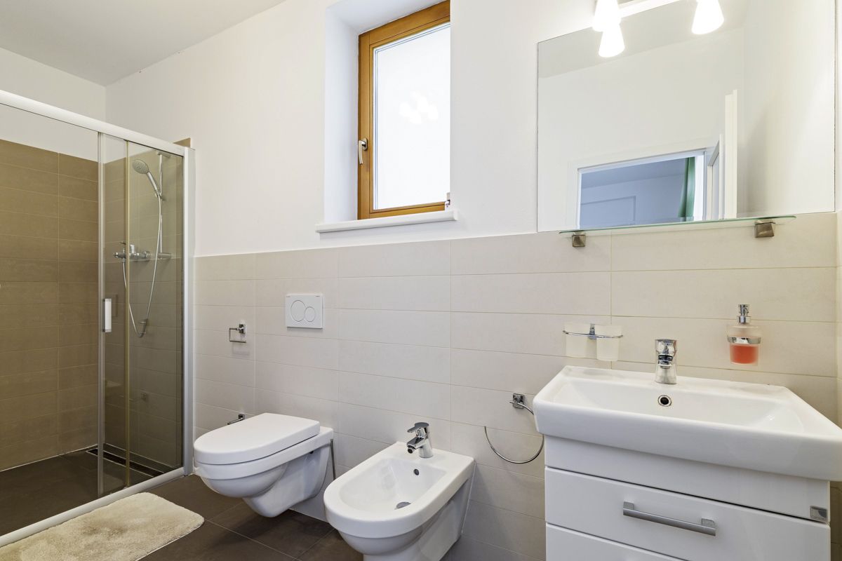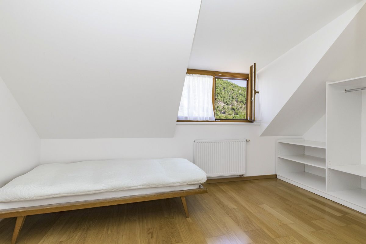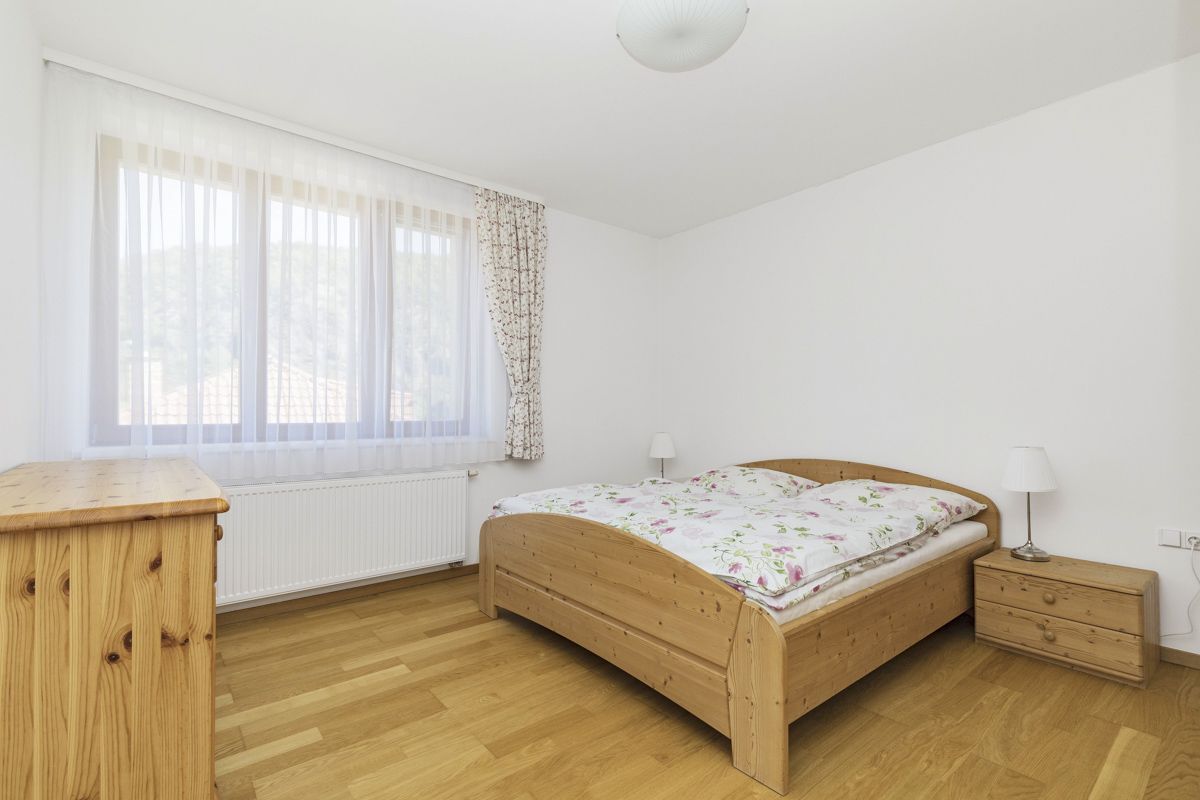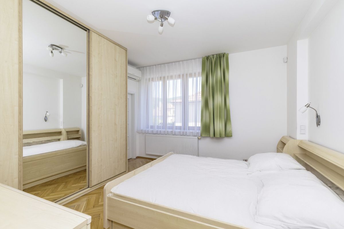 Tento dům k pronájmu v přízemí nabízí k užívání vstupní chodbu, prostorný obývací pokoj, plně vybavený kuchyňský kout (sklokeramická deska, trouba, lednice, mrazák, mikrovlnná trouba a myčka nádobí), jídelnu, přímý vstup na zahradu s posezením a samostatnou toaletu. První patro nabízí obývací místnost s jídelní částí, 3 ložnice, 2 koupelny (sprchový kout, toaleta a bidet). Byt je navíc vybaven tepelným čerpadlem, trojsklem a klimatizací v ložnici. K domu náleží garáž.
