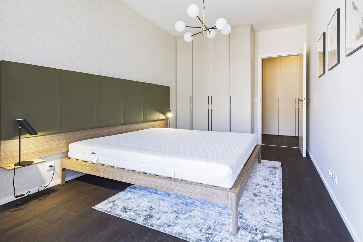 Tento zařízený byt 2+kk k pronájmu dispozičně nabízí vstupní chodbu s vestavěnými skříněmi, prostorný obývací pokoj s plně vybaveným kuchyňský koutem (indukční deska, trouba, lednice, parní trouba, myčka nádobí a vinotéka) včetně jídelní části, samostatnou ložnici s vestavěnými skříněmi, koupelnu disponující sprchovým koutem a komoru s pračkou a sušičkou, která bude dodána. K bytu náleží terasa, která je přístupná z obývacího pokoje i z ložnice. Byt byl vybaven nábytkem na míru. V ceně nájemného je zahrnut sklep a garážové parkovací stání.