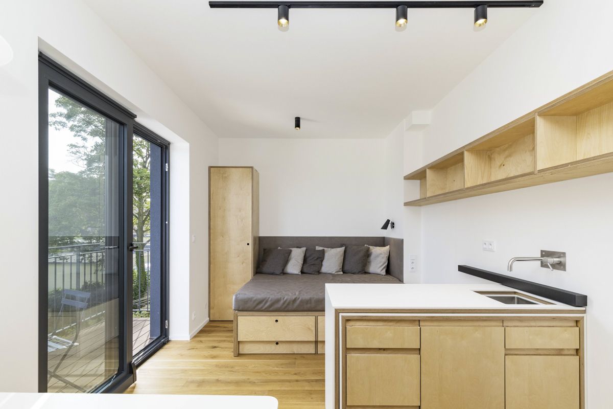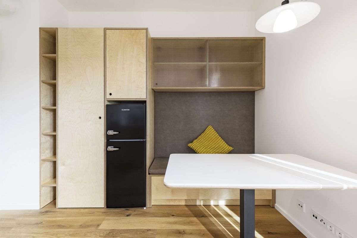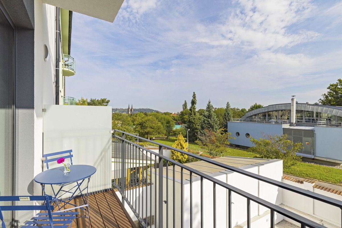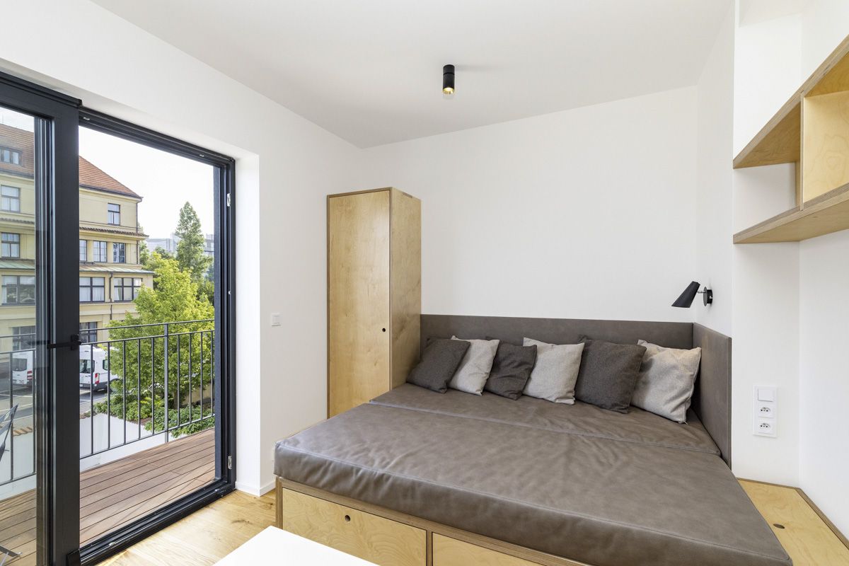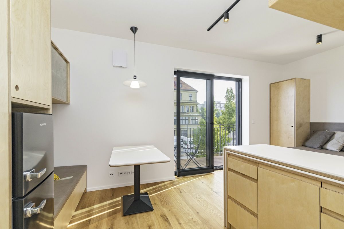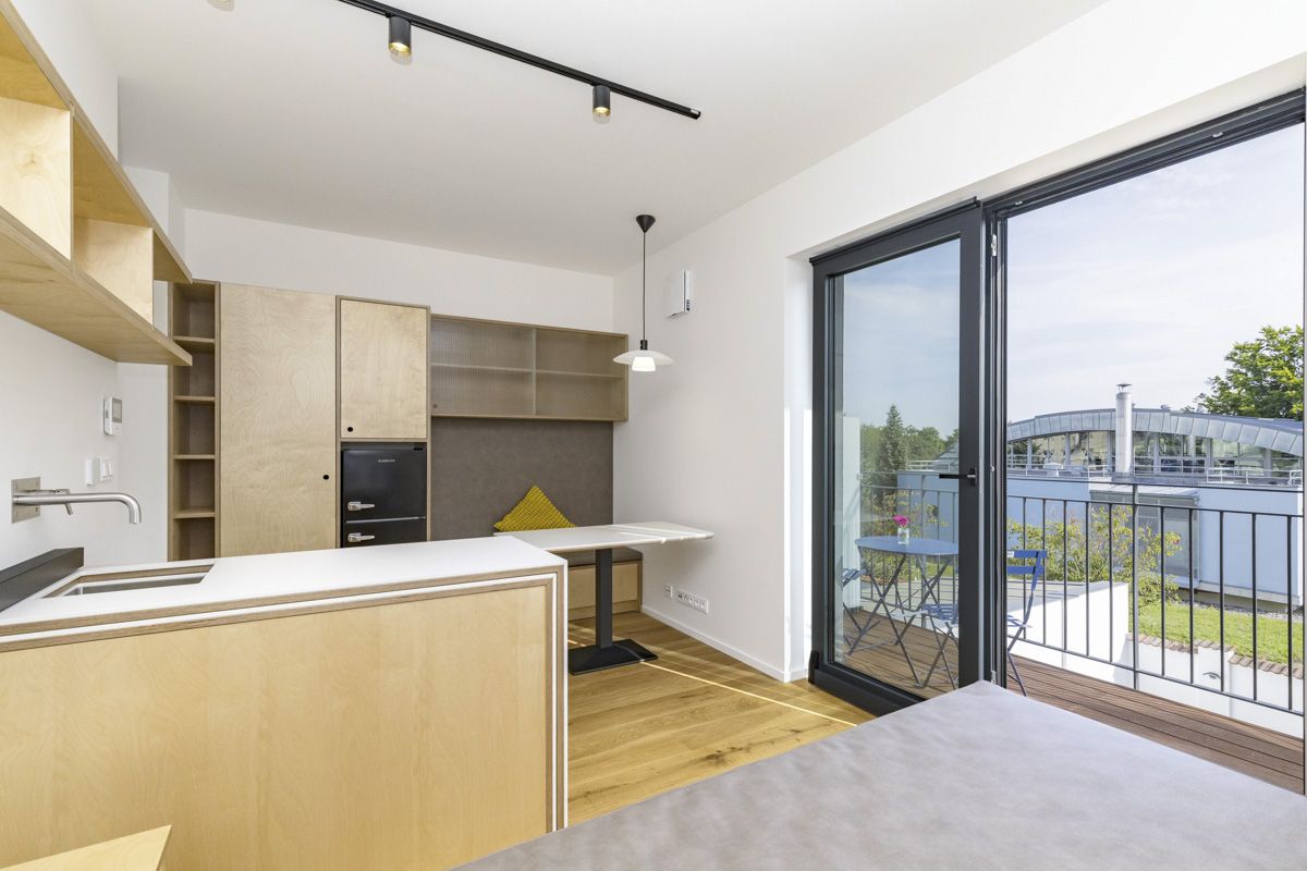 New furnished studio apartment with balcony on the 1st floor of the residential project Topolka in Prague 4 immediate vicinity of Vyšehrad