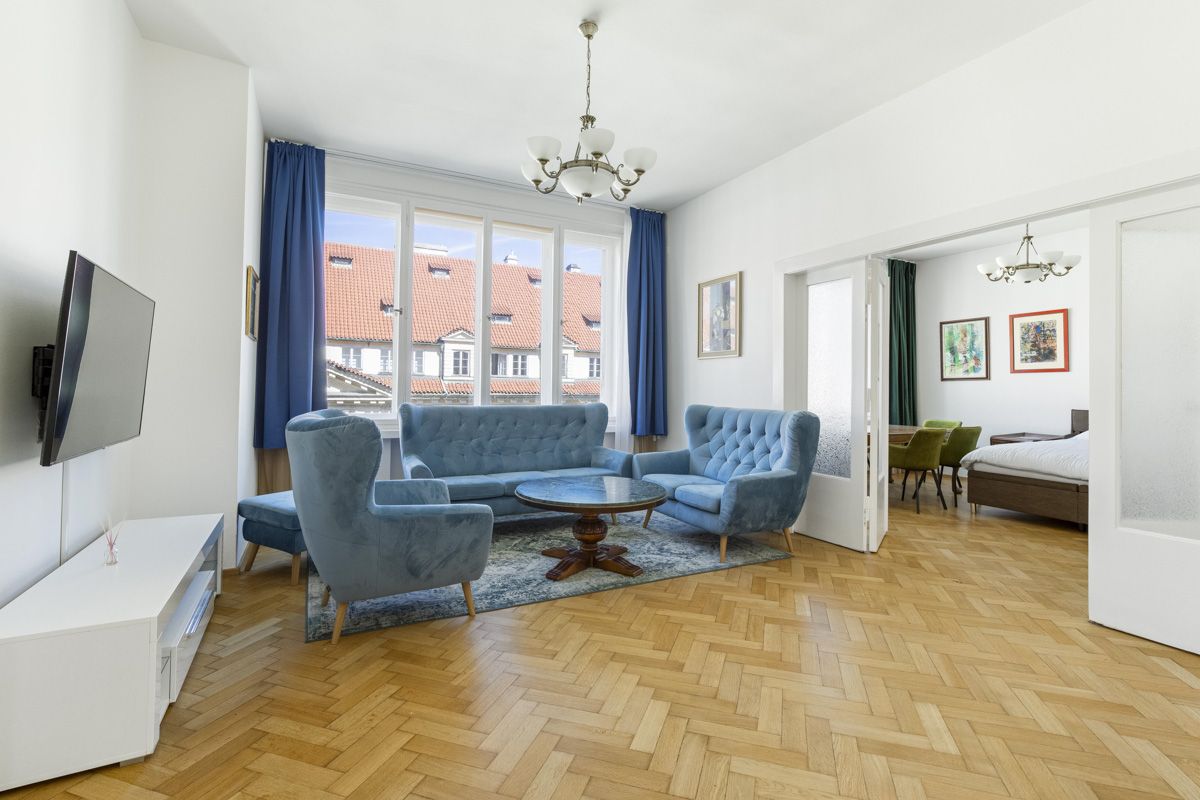 We offer for rent a luxuriously furnished 2-bedroom apartment with an area of 100 sqm on the 3rd floor of a functionalist building with an elevator. The property is located in a beautiful location in Prague 1 - Nove Mesto, with all civic amenities and good transport infrastructure.