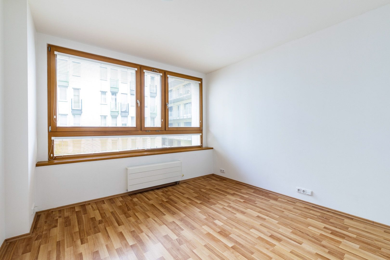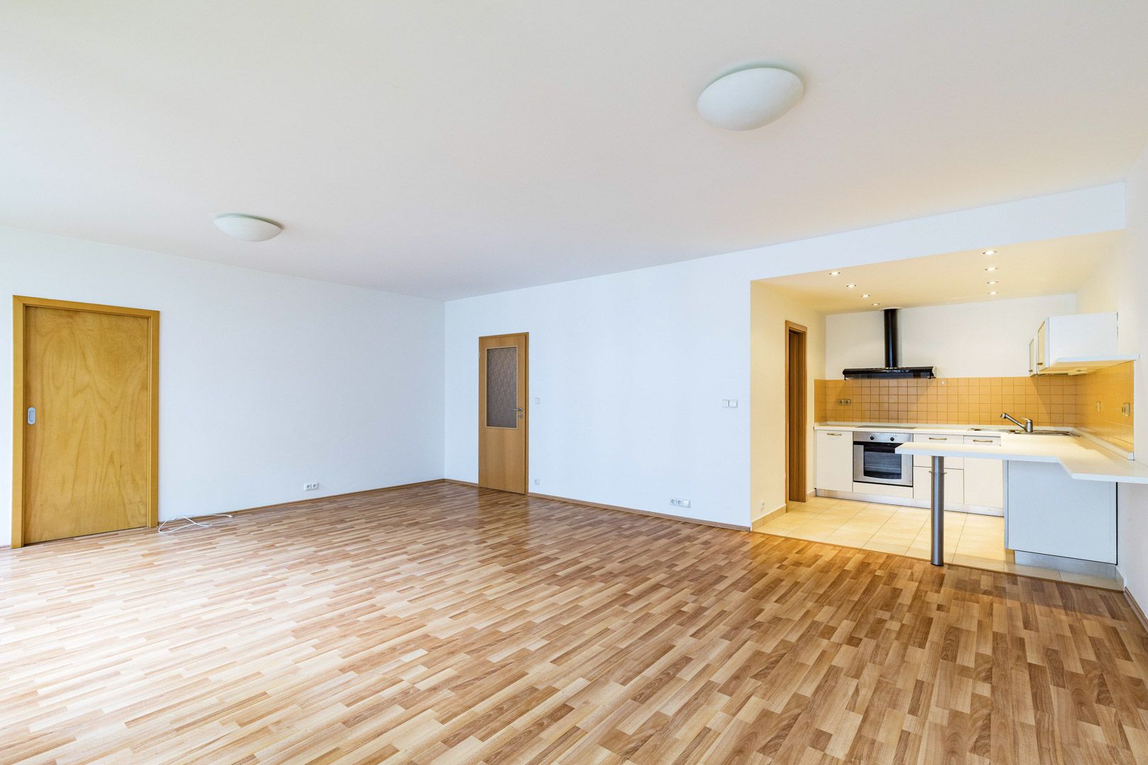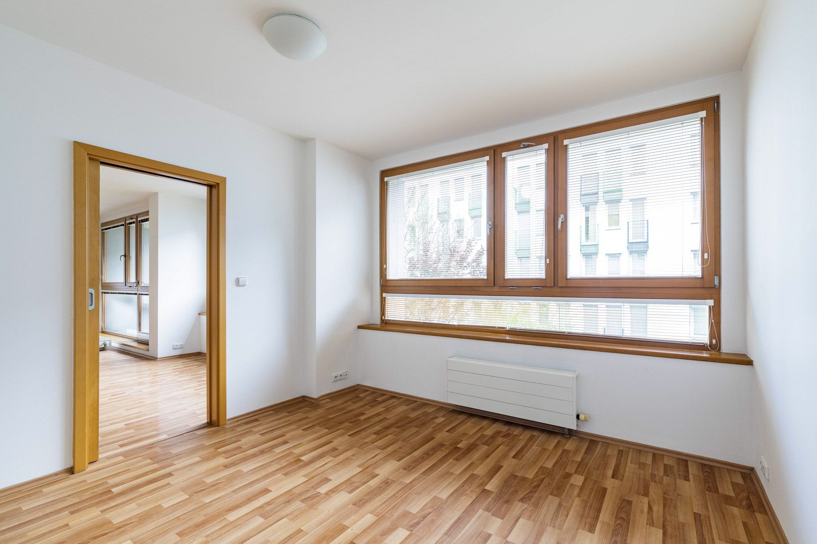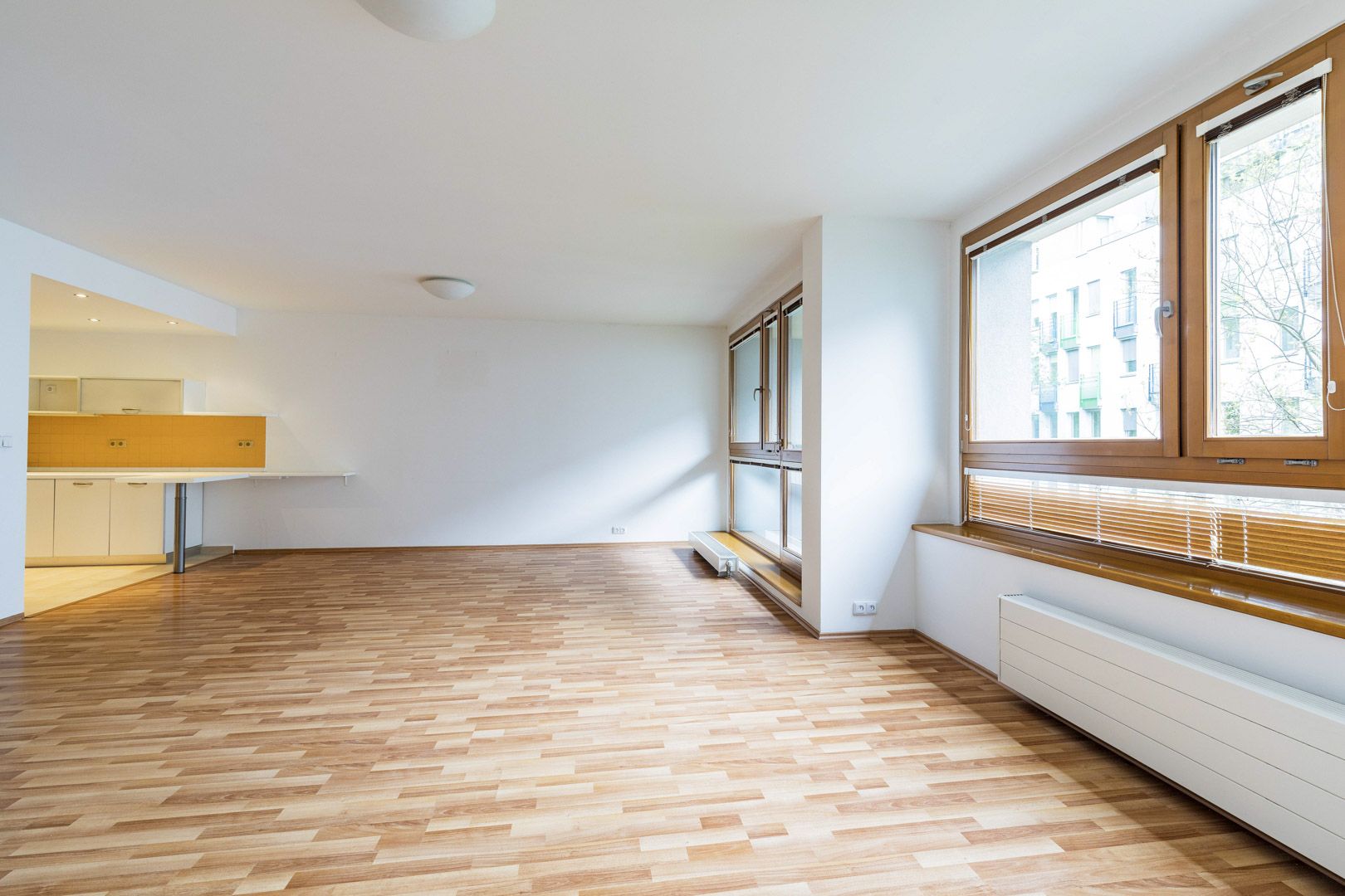 This bright unfurnished 1-bedroom apartment for rent offers an entrance hall, spacious open plan living room with access to the balcony, fully equipped kitchenette (stove, oven, fridge, freezer and dishwasher) including dining area, master bedroom, bathroom with a bathtub and shower and a storage room. The apartment has a balcony facing a quiet courtyard. The rent includes basement. Two parking spaces for an additional fee of CZK 1,500.