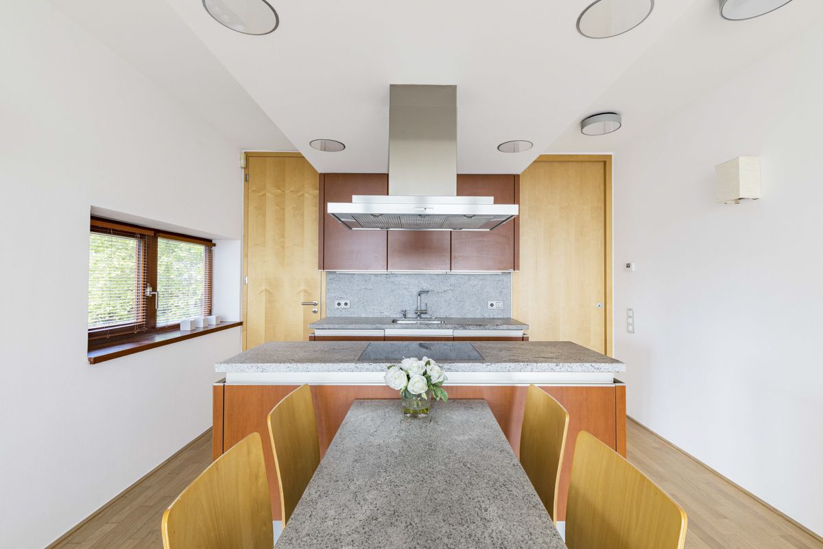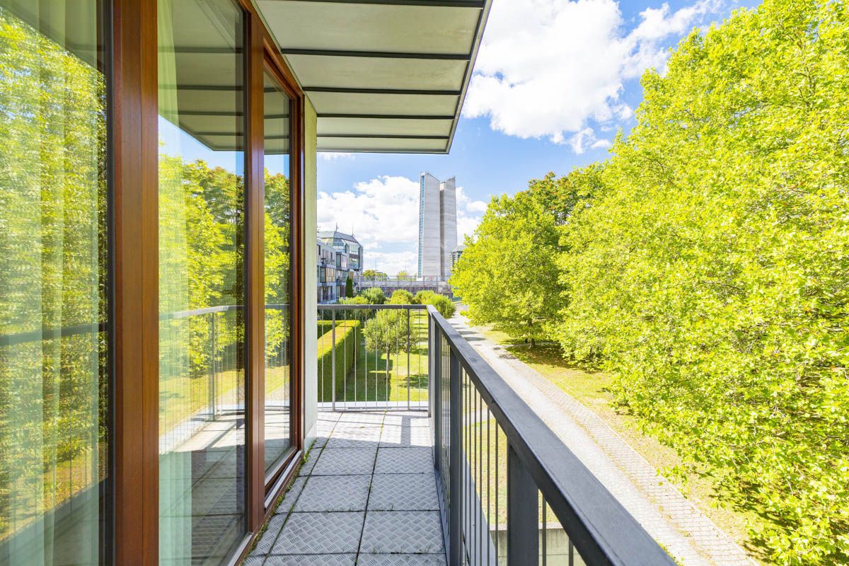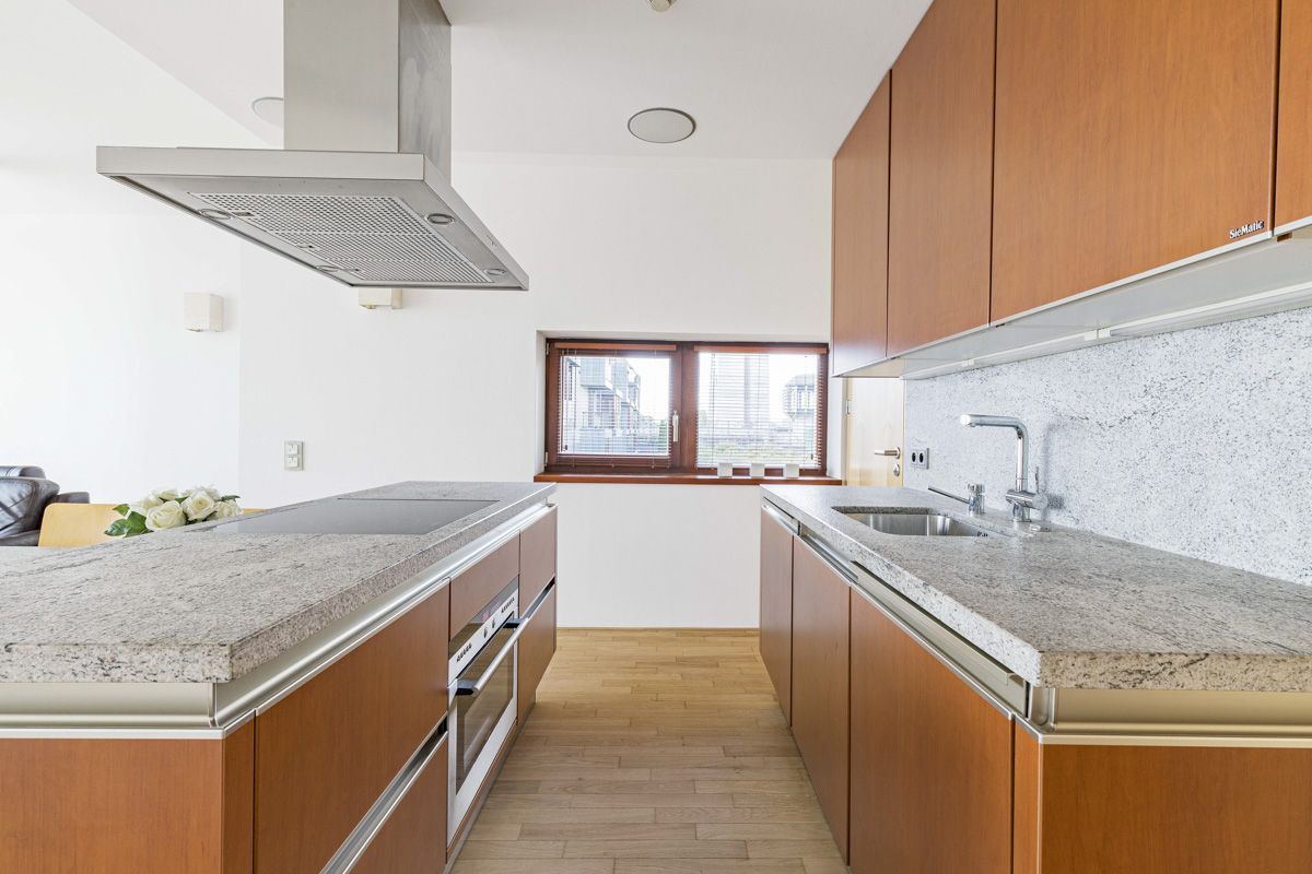 This apartment offers a living room with south-facing French panoramic windows with a fully equipped Siematic kitchen with granite worktops and Miele, Siemens, AEG and Liebherr appliances. The apartment also has a bedroom with French windows and access to the balcony, entrance hall, bathroom with bath, separate toilet and a storage room with washing machine combined with dryer. There is internet and wifi throughout the apartment and a home cinema in the living room. The apartment has a separate cellar. Other equipment: wooden parquet and tiles, interstitial and wall air conditioning Daikin, Viesmann condensing boiler with underfloor heating, home videophone, built-in wardrobe walls, mirrors, coat rack, shoe rack, all tailored to the apartment.