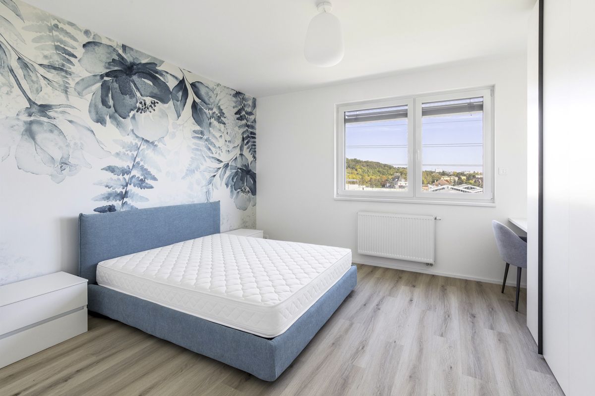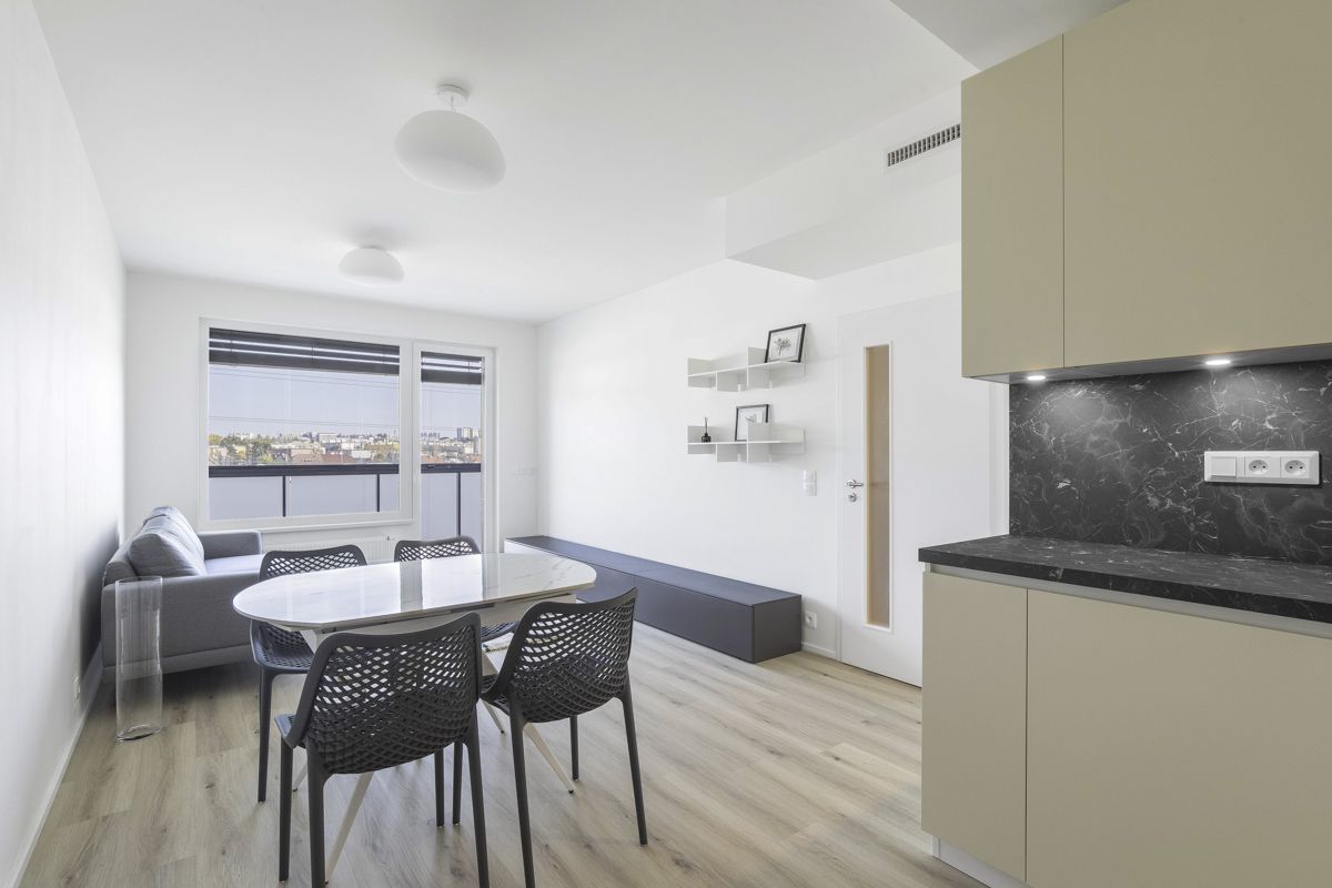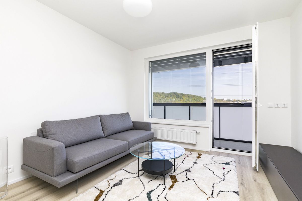 Tento světlý zařízený byt 2+kk k pronájmu nabízí k užívání vstupní chodbu, prostorný obývací pokoj, plně vybavenou kuchyni. Ložnice, koupelna (sprchový kout a toaleta). K bytu náleží prostorná lodžie, okna na celém bytě mají trojitá skla chránicí před hlukem. Celý byt spolu se zařízením je úplně nový a všechno bylo vybírané na míru s pomocí architekta. K bytu patří sklep, který se nachází na stejném patře přímo naproti výtahu a garážové stání. Součástí rezidenční budovy je místnost pro kočárky a další místnost pro mytí kol a psů.