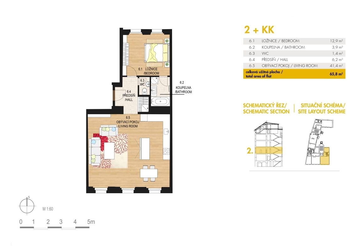 We offer for rent a furnishedone-bedroom apartment with an area of 65.8 sqm, located on the 2nd floor of a building with an elevator. The apartment is located in the heart of Prague 1 - Nove Mesto, offering all civic amenities and good transport infrastructure.