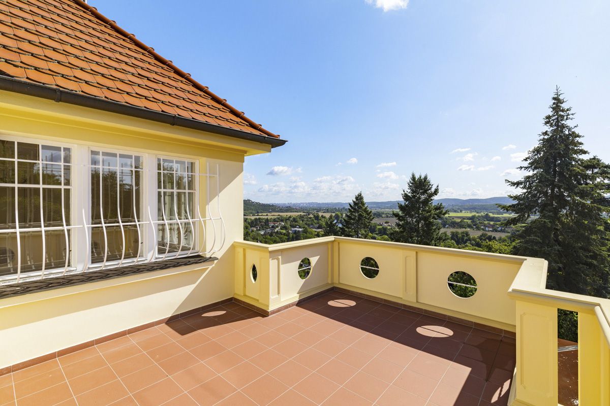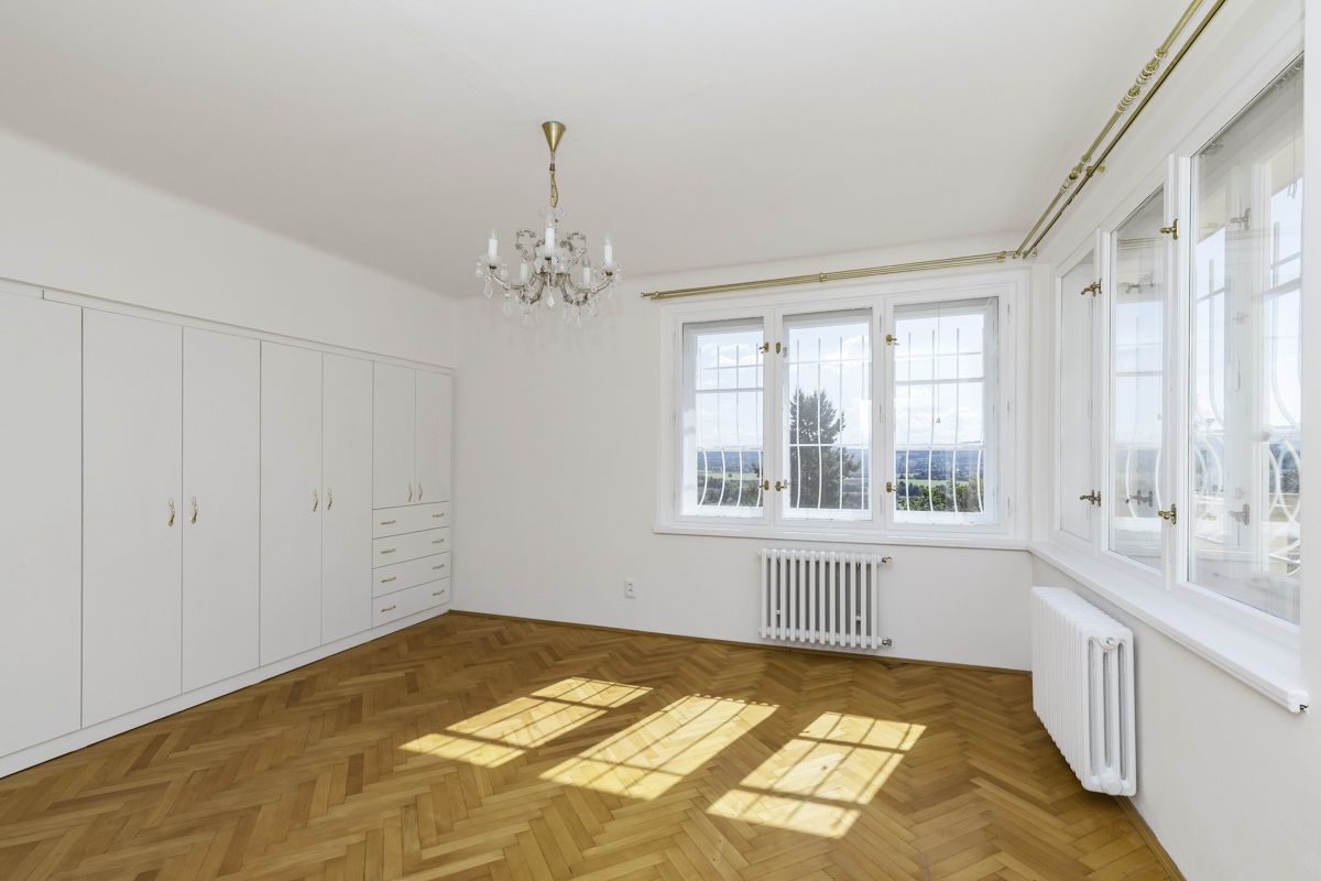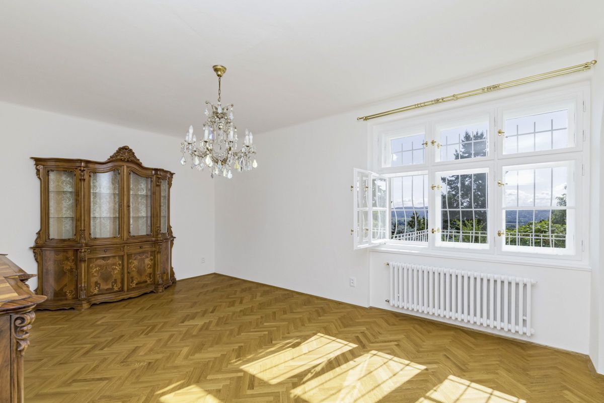 Tato vila je částečně zařízená a v přízemí domu nabízí k užívání vstupní chodbu, jídelní část, prostorný obývací pokoj s krbem, plně vybavenou kuchyň a koupelnu (vana, toaleta, bidet a pračka) s přímým vstupem na terasu a samostatnou toaletu. V 1. patře pak nabízí 1. ložnici s vestavěnou skříní, 2.ložnici s přímým vstupem na terasu a 3. ložnici s šatnou a půdní prostor. V podzemním patře domu naleznete k užívání 2 ložnice, technickou místnost, koupelnu (vana a toaleta), samostatnou toaletu a malou kuchyň s jídelním prostorem s přímým vstupem na zahradu. K domu patří dvojgaráž, zahrada a venkovní bazén s nádherným výhledem na Prahu.