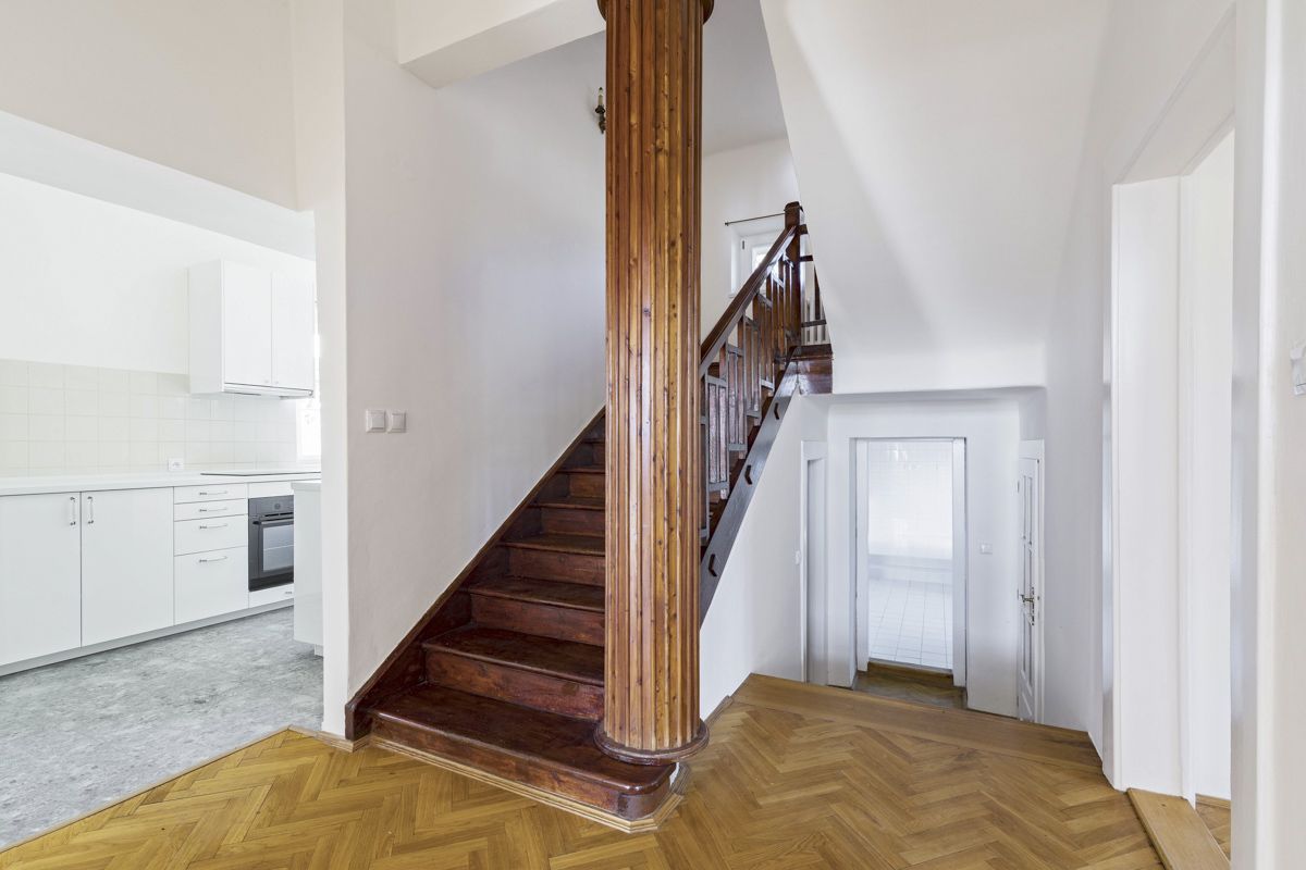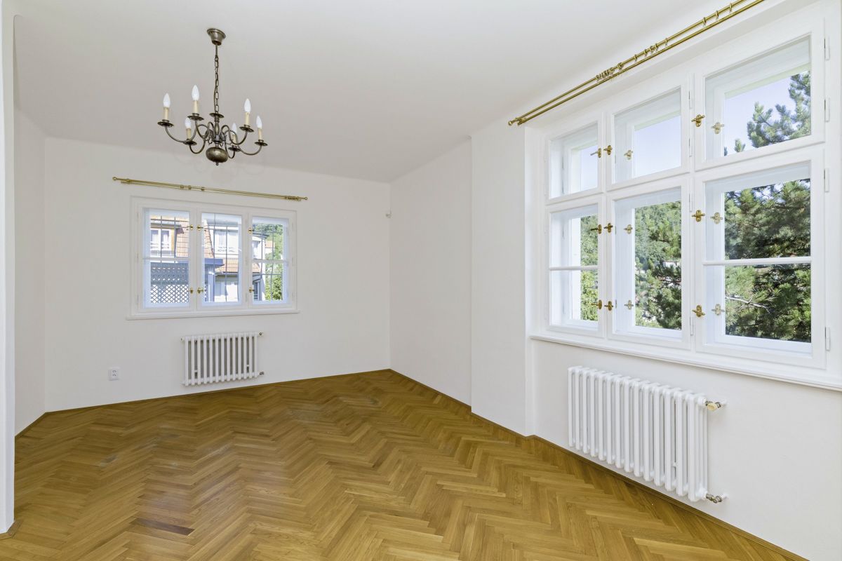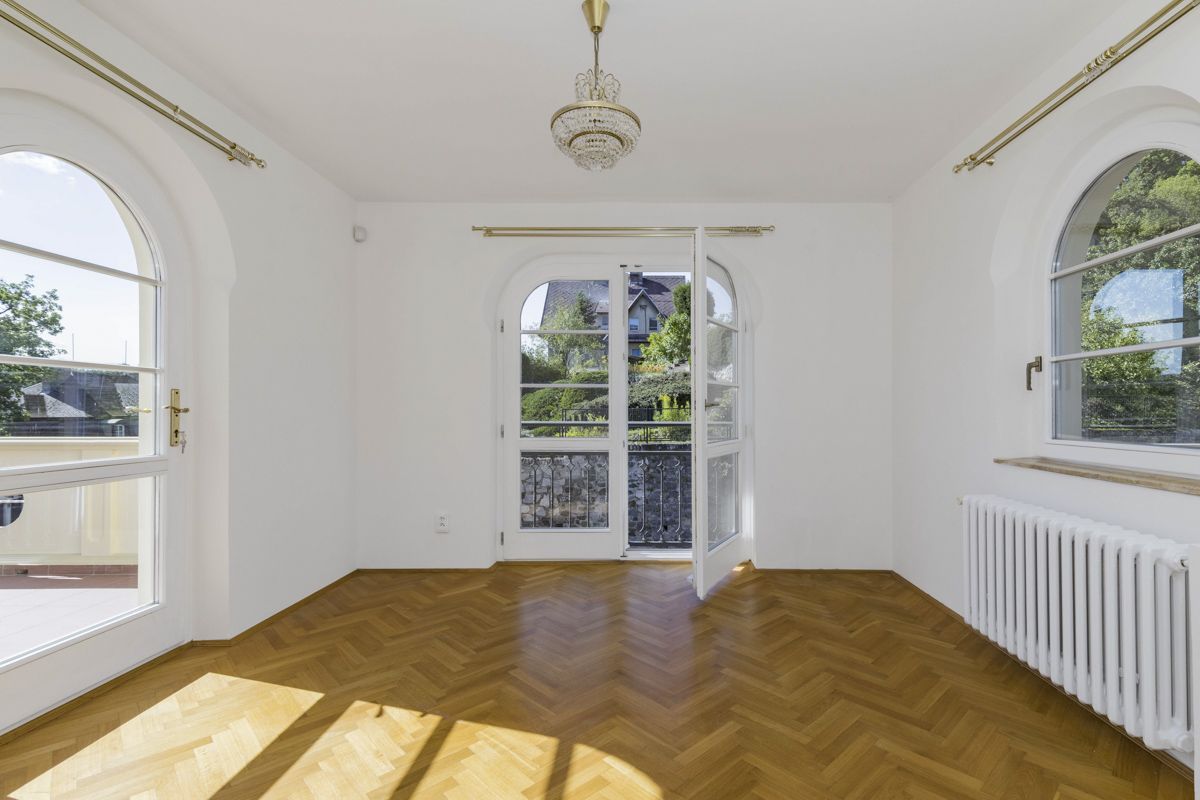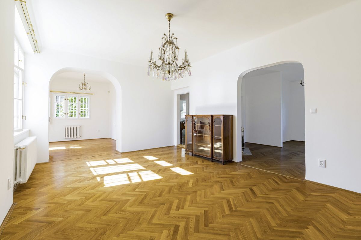 Tato vila je částečně zařízená a v přízemí domu nabízí k užívání vstupní chodbu, jídelní část, prostorný obývací pokoj s krbem, plně vybavenou kuchyň a koupelnu (vana, toaleta, bidet a pračka) s přímým vstupem na terasu a samostatnou toaletu. V 1. patře pak nabízí 1. ložnici s vestavěnou skříní, 2.ložnici s přímým vstupem na terasu a 3. ložnici s šatnou a půdní prostor. V podzemním patře domu naleznete k užívání 2 ložnice, technickou místnost, koupelnu (vana a toaleta), samostatnou toaletu a malou kuchyň s jídelním prostorem s přímým vstupem na zahradu. K domu patří dvojgaráž, zahrada a venkovní bazén s nádherným výhledem na Prahu.
