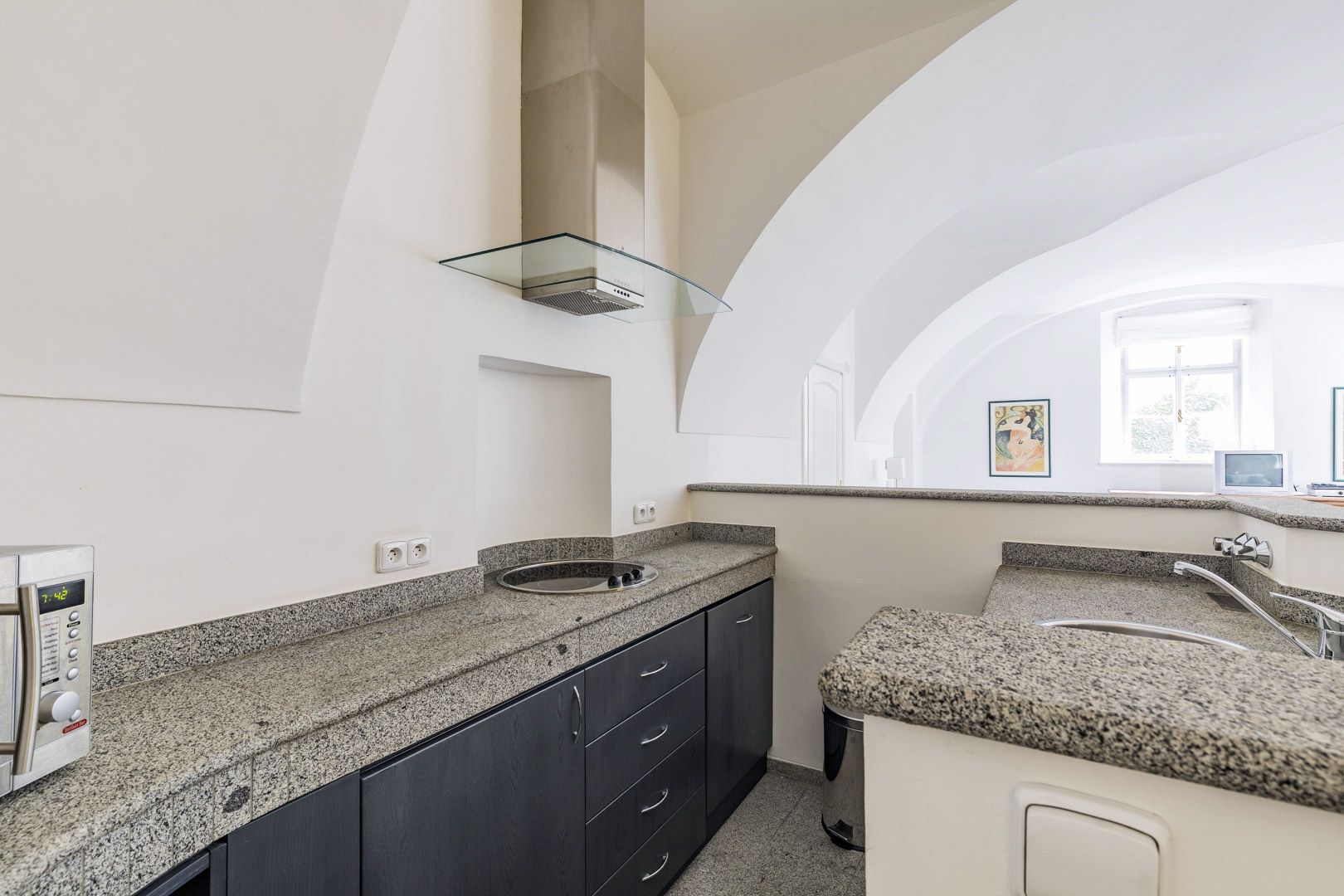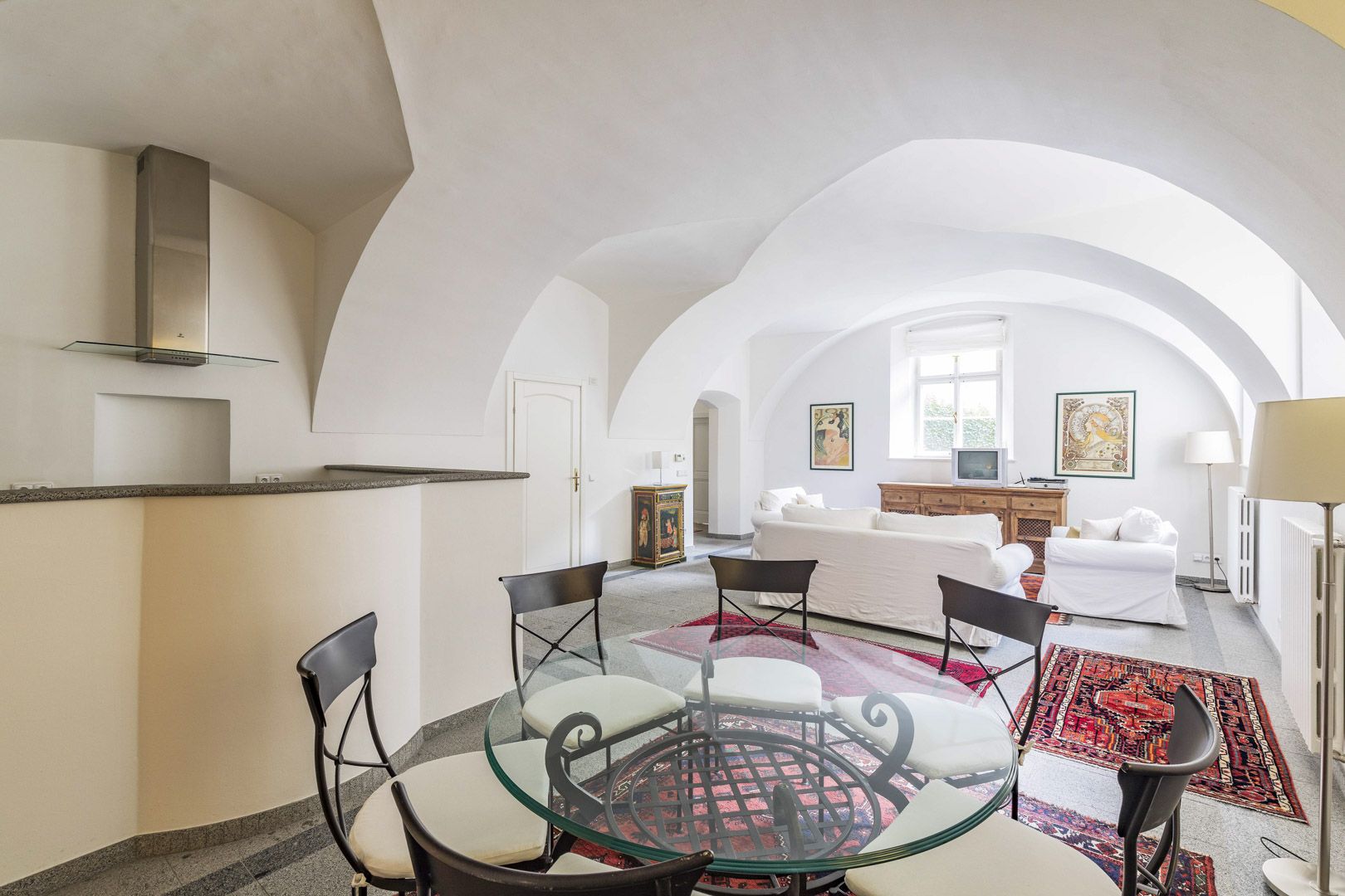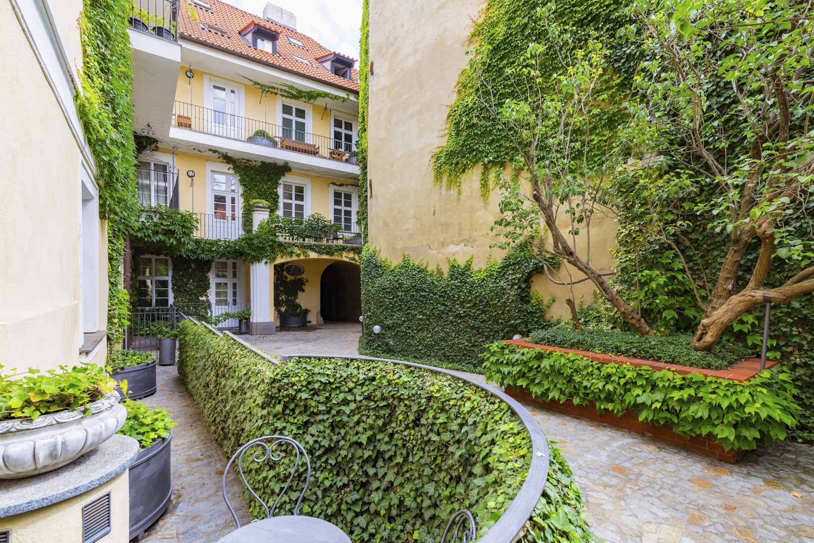 Atypical apartment with vaulted ceilings and with spacious terrace for rent located on the ground floor of a historic building directly under the Petřín lookout tower in a beautiful part of Prague 1 - Malá Strana.