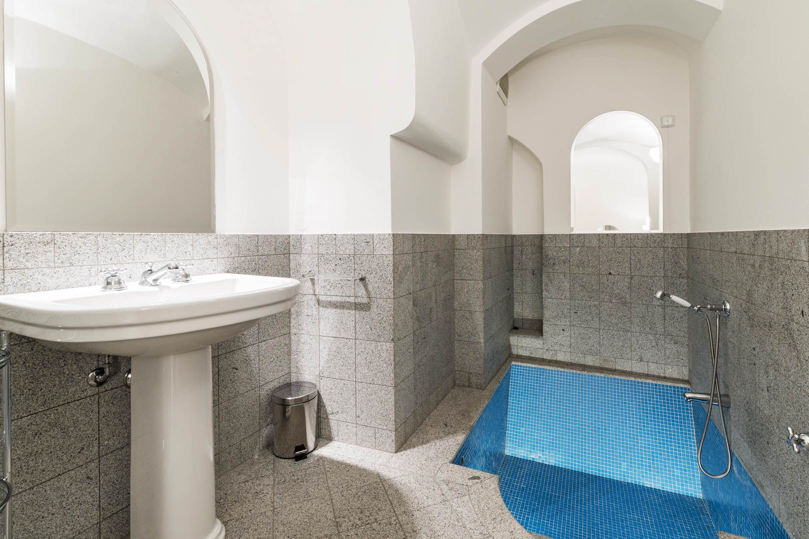 Completely furnished interior with an area of 92 sqm offers to use entrance hall, living room with fully equipped kitchenette (ceramic hob, oven, fridge, freezer, dishwasher, microwave) dining area and entrance to the terrace, bedroom with dressing room, two bathrooms, one with a sunken bathtub, the other one with shower, and a chamber.