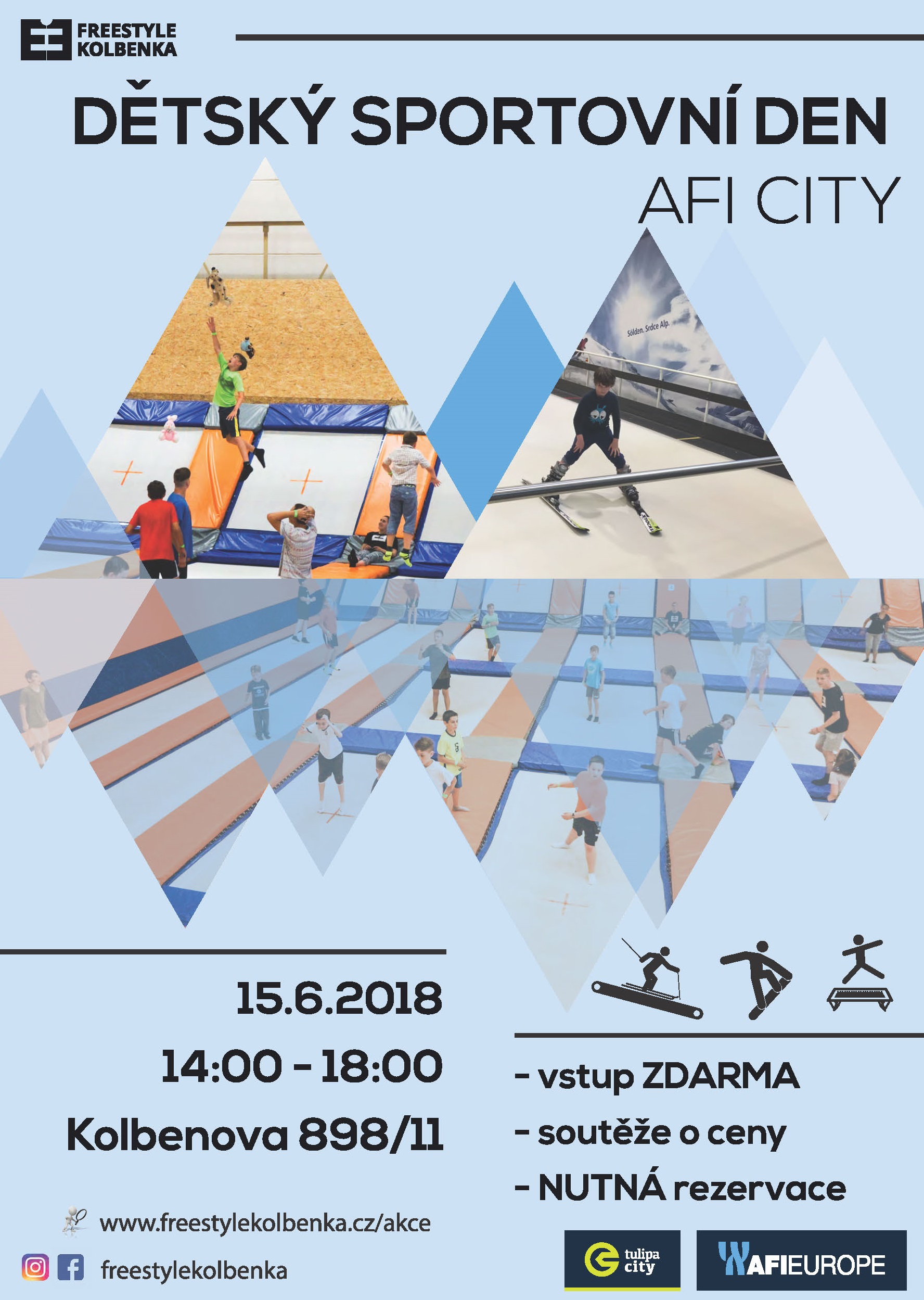 Tulipa City ve spolupráci s Freestyle Kolbenka pořádá v pátek 15. června 2018 Dětský sportovní den AFI City! Pro Vaše děti je připraveno celkem pět stanovišť, kde si mohou nespoutaně hrát, zatímco Vy si můžete hrát s myšlenkou o novém bydlení v projektu Tulipa City. Rezervace je nezbytná a počet míst je omezený, proto neváhejte a přihlaste se včas: https://freestylekolbenka.isportsystem.cz/